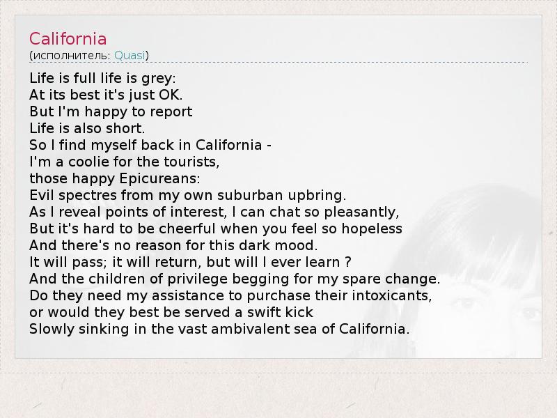 Life is full life is grey: At its best it's just OK. But I'm happy to report Life is also short. So I find myself back in California - I'm a coolie for the tourists, those happy Epicureans: Evil spectres from my own suburban upbring. As I reveal points of interest, I can chat so pleasantly, But it's hard to be cheerful when you feel so hopeless And there's no reason for this dark mood. It will pass; it will return, but will I ever learn ? And the children of privilege begging for my spare change. Do they need my assistance to purchase their intoxicants, or would they best be served a swift kick Slowly sinking in the vast ambivalent sea of California.