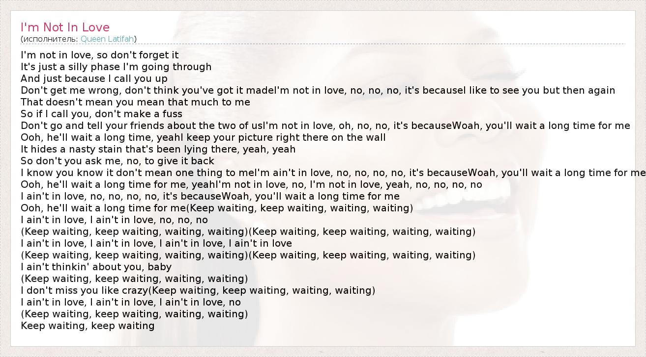 I'm not in love, so don't forget it It's just a silly phase I'm going through And just because I call you up Don't get me wrong, don't think you've got it madeI'm not in love, no, no, no, it's becauseI like to see you but then again That doesn't mean you mean that much to me So if I call you, don't make a fuss Don't go and tell your friends about the two of usI'm not in love, oh, no, no, it's becauseWoah, you'll wait a long time for me Ooh, he'll wait a long time, yeahI keep your picture right there on the wall It hides a nasty stain that's been lying there, yeah, yeah So don't you ask me, no, to give it back I know you know it don't mean one thing to meI'm ain't in love, no, no, no, no, it's becauseWoah, you'll wait a long time for me Ooh, he'll wait a long time for me, yeahI'm not in love, no, I'm not in love, yeah, no, no, no, no I ain't in love, no, no, no, no, it's becauseWoah, you'll wait a long time for me Ooh, he'll wait a long time for me(Keep waiting, keep waiting, waiting, waiting) I ain't in love, I ain't in love, no, no, no (Keep waiting, keep waiting, waiting, waiting)(Keep waiting, keep waiting, waiting, waiting) I ain't in love, I ain't in love, I ain't in love, I ain't in love (Keep waiting, keep waiting, waiting, waiting)(Keep waiting, keep waiting, waiting, waiting) I ain't thinkin' about you, baby (Keep waiting, keep waiting, waiting, waiting) I don't miss you like crazy(Keep waiting, keep waiting, waiting, waiting) I ain't in love, I ain't in love, I ain't in love, no (Keep waiting, keep waiting, waiting, waiting) Keep waiting, keep waiting