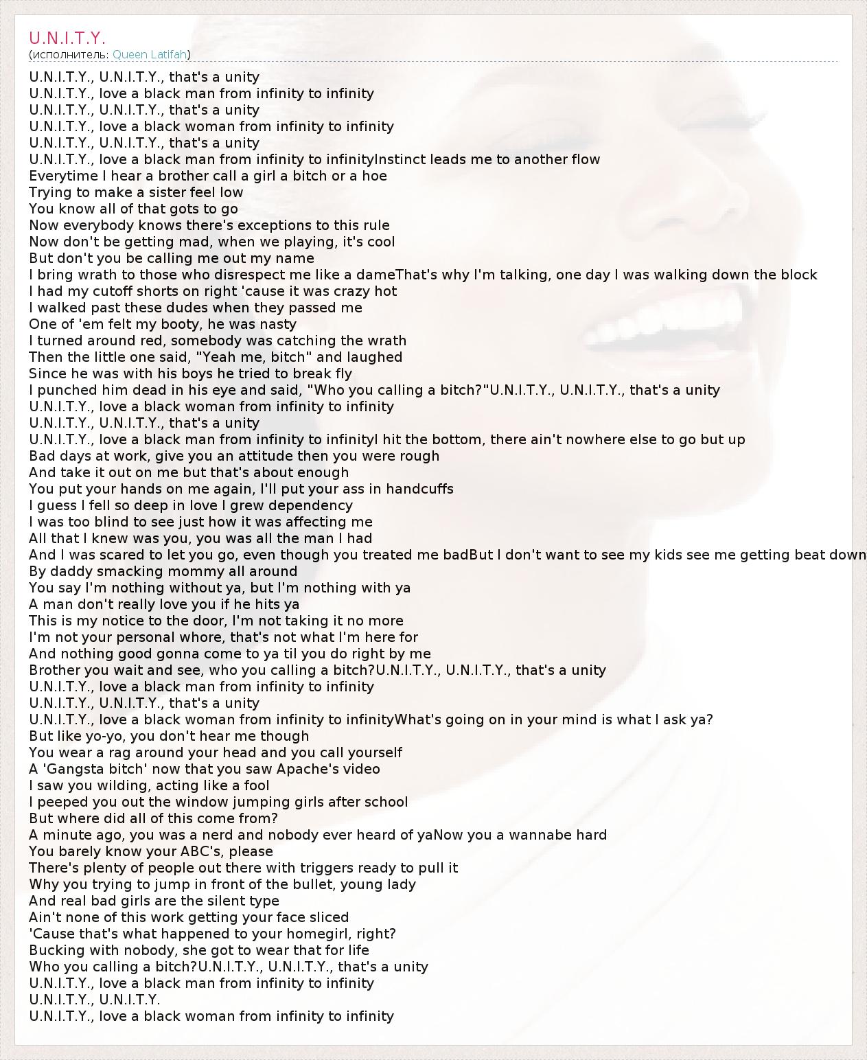 I punched him dead in his eye and said, "Who you calling a bitch?"U.N.I.T.Y., U.N.I.T.Y., that's a unity