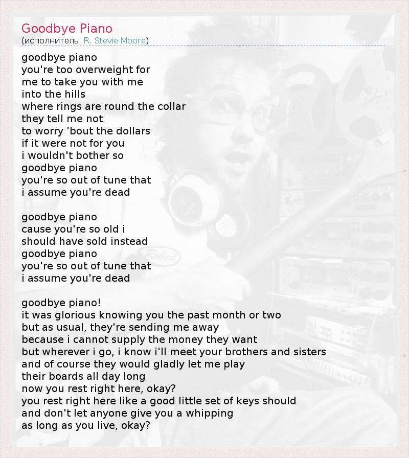 goodbye piano you're too overweight for me to take you with me into the hills where rings are round the collar they tell me not to worry 'bout the dollars if it were not for you i wouldn't bother so goodbye piano you're so out of tune that i assume you're dead goodbye piano cause you're so old i should have sold instead goodbye piano you're so out of tune that i assume you're dead goodbye piano! it was glorious knowing you the past month or two but as usual, they're sending me away because i cannot supply the money they want but wherever i go, i know i'll meet your brothers and sisters and of course they would gladly let me play their boards all day long now you rest right here, okay? you rest right here like a good little set of keys should and don't let anyone give you a whipping as long as you live, okay?