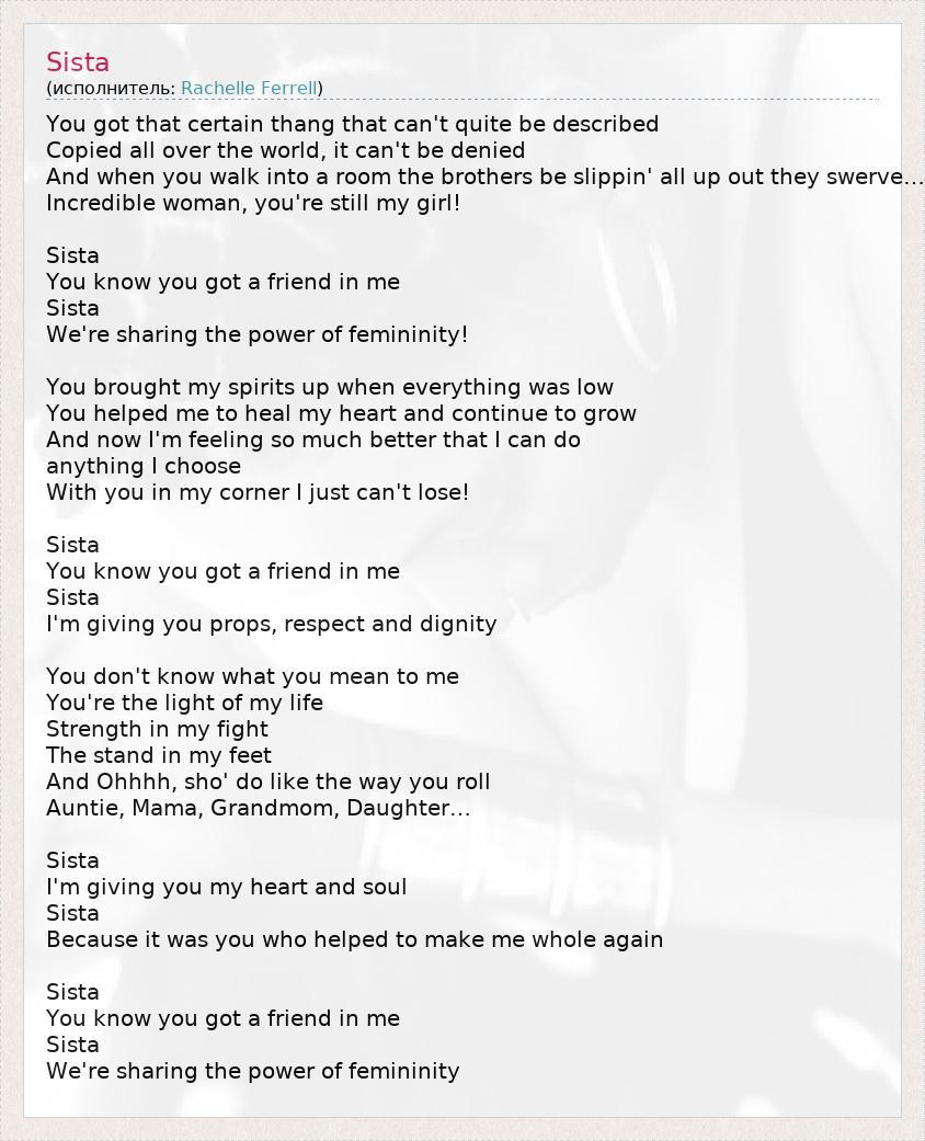 Вы получили , что некоторые Тханг , которые не могут достаточно описать Скопировано во всем мире , он не может быть отказано И когда вы входите в комнату братья быть пряталась все зависит , что они свернуть ... Невероятный женщина, ты все еще моя девушка ! Sista Вы знаете, что есть друг в меня Sista Мы обмен власти женственности ! Вы принесли мне настроение , когда все было низким Вы помогли мне исцелить мое сердце и продолжают расти И теперь я чувствую себя настолько лучше, что я могу сделать, ничего я выбираю С вами в моем углу , я просто не могу проиграть! Sista Вы знаете, что есть друг в меня Sista Я даю вам реквизит , уважение и достоинство Вы не знаете, что ты для меня значишь Ты свет моей жизни Сила в моей борьбе Стенд в ногах И Оооо , шо " нравится , как вы ролл Тетушка , мама, бабуля , дочь ... Sista Я даю вам свое сердце и душу Sista Потому что это вы помогли сделать меня все снова Sista Вы знаете, что есть друг в меня Sista Мы обмен власти женственности