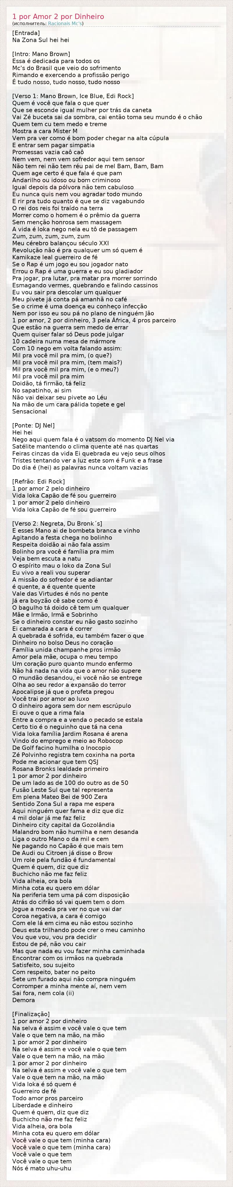 [Entrada] Na Zona Sul hei hei [Intro: Mano Brown] Essa é dedicada para todos os Mc's do Brasil que veio do sofrimento Rimando e exercendo a profissão perigo É tudo nosso, tudo nosso, tudo nosso [Verso 1: Mano Brown, Ice Blue, Edi Rock] Quem é você que fala o que quer Que se esconde igual mulher por trás da caneta Vai Zé buceta sai da sombra, cai então toma seu mundo é o chão Quem tem cu tem medo e treme Mostra a cara Mister M Vem pra ver como é bom poder chegar na alta cúpula E entrar sem pagar simpatia Promessas vazia caô caô Nem vem, nem vem sofredor aqui tem sensor Não tem rei não tem réu pai de mel Bam, Bam, Bam Quem age certo é que fala é que pam Andarilho ou idoso ou bom criminoso Igual depois da pólvora não tem cabuloso Eu nunca quis nem vou agradar todo mundo E rir pra tudo quanto é que se diz vagabundo O rei dos reis foi traído na terra Morrer como o homem é o prêmio da guerra Sem menção honrosa sem massagem A vida é loka nego nela eu tô de passagem Zum, zum, zum, zum, zum Meu cérebro balançou século XXI Revolução não é pra qualquer um só quem é Kamikaze leal guerreiro de fé Se o Rap é um jogo eu sou jogador nato Errou o Rap é uma guerra e eu sou gladiador Pra jogar, pra lutar, pra matar pra morrer sorrindo Esmagando vermes, quebrando e falindo cassinos Eu vou sair pra descolar um qualquer Meu pivete já conta pá amanhã no café Se o crime é uma doença eu conheço infecção Nem por isso eu sou pá no plano de ninguém Jão 1 por amor, 2 por dinheiro, 3 pela África, 4 pros parceiro Que estão na guerra sem medo de errar Quem quiser falar só Deus pode julgar 10 cadeira numa mesa de mármore Com 10 nego em volta falando assim: Mil pra você mil pra mim, (o que?) Mil pra você mil pra mim, (tem mais?) Mil pra você mil pra mim, (e o meu?) Mil pra você mil pra mim Doidão, tá firmão, tá feliz No sapatinho, ai sim Não vai deixar seu pivete ao Léu Na mão de um cara pálida topete e gel Sensacional [Ponte: DJ Nel] Hei hei Nego aqui quem fala é o vatsom do momento DJ Nel via Satélite mantendo o clima quente até nas quartas Feiras cinzas da vida Ei quebrada eu vejo seus olhos Tristes tentando ver a luz este som é Funk e a frase Do dia é (hei) as palavras nunca voltam vazias [Refrão: Edi Rock] 1 por amor 2 pelo dinheiro Vida loka Capão de fé sou guerreiro 1 por amor 2 pelo dinheiro Vida loka Capão de fé sou guerreiro [Verso 2: Negreta, Du Bronk´s] E esses Mano ai de bombeta branca e vinho Agitando a festa chega no bolinho Respeita doidão ai não fala assim Bolinho pra você é família pra mim Veja bem escuta a natu O espírito mau o loko da Zona Sul Eu vivo a reali vou superar A missão do sofredor é se adiantar é quente, a é quente quente Vale das Virtudes é nós no pente Já era boyzão cê sabe como é O bagulho tá doido cê tem um qualquer Mãe e Irmão, Irmã e Sobrinho Se o dinheiro constar eu não gasto sozinho Ei camarada a cara é correr A quebrada é sofrida, eu também fazer o que Dinheiro no bolso Deus no coração Família unida champanhe pros irmão Amor pela mãe, ocupa o meu tempo Um coração puro quanto mundo enfermo Não há nada na vida que o amor não supere O mundão desandou, ei você não se entrege Olha ao seu redor a expansão do terror Apocalipse já que o profeta pregou Você trai por amor ao luxo O dinheiro agora sem dor nem escrúpulo Ei ouve o que a rima fala Entre a compra e a venda o pecado se estala Certo tio é o neguinho que tá na cena Vida loka família Jardim Rosana é arena Vindo do emprego e meio ao Robocop De Golf facino humilha o Inocopio Zé Polvinho registra tem coxinha na porta Pode me acionar que tem QSJ Rosana Bronks lealdade primeiro 1 por amor 2 por dinheiro De um lado as de 100 do outro as de 50 Fusão Leste Sul que tal representa Em plena Mateo Bei de 900 Zera Sentido Zona Sul a rapa me espera Aqui ninguém quer fama e diz que diz 4 mil dolar já me faz feliz Dinheiro city capital da Gozolândia Malandro bom não humilha e nem desanda Liga o outro Mano o da mil e cem Ne pagando no Capão é que mais tem De Audi ou Citroen já disse o Brow Um role pela fundão é fundamental Quem é quem, diz que diz Buchicho não me faz feliz Vida alheia, ora bola Minha cota eu quero em dólar Na periferia tem uma pá com disposição Atrás do cifrão só vai quem tem o dom Jogue a moeda pra ver no que vai dar Coroa negativa, a cara é comigo Com ele lá em cima eu não estou sozinho Deus esta trilhando pode crer o meu caminho Vou que vou, vou pra decidir Estou de pé, não vou cair Mas que nada eu vou fazer minha caminhada Encontrar com os irmãos na quebrada Satisfeito, sou sujeito Com respeito, bater no peito Sete um furado aqui não compra ninguém Corromper a minha mente aí, nem vem Sai fora, nem cola (ii) Demora [Finalização] 1 por amor 2 por dinheiro Na selva é assim e você vale o que tem Vale o que tem na mão, na mão 1 por amor 2 por dinheiro Na selva é assim e você vale o que tem Vale o que tem na mão, na mão 1 por amor 2 por dinheiro Na selva é assim e você vale o que tem Vale o que tem na mão, na mão Vida loka é só quem é Guerreiro de fé Todo amor pros parceiro Liberdade e dinheiro Quem é quem, diz que diz Buchicho não me faz feliz Vida alheia, ora bola Minha cota eu quero em dólar Você vale o que tem (minha cara) Você vale o que tem (minha cara) Você vale o que tem Você vale o que tem Nós é mato uhu-uhu