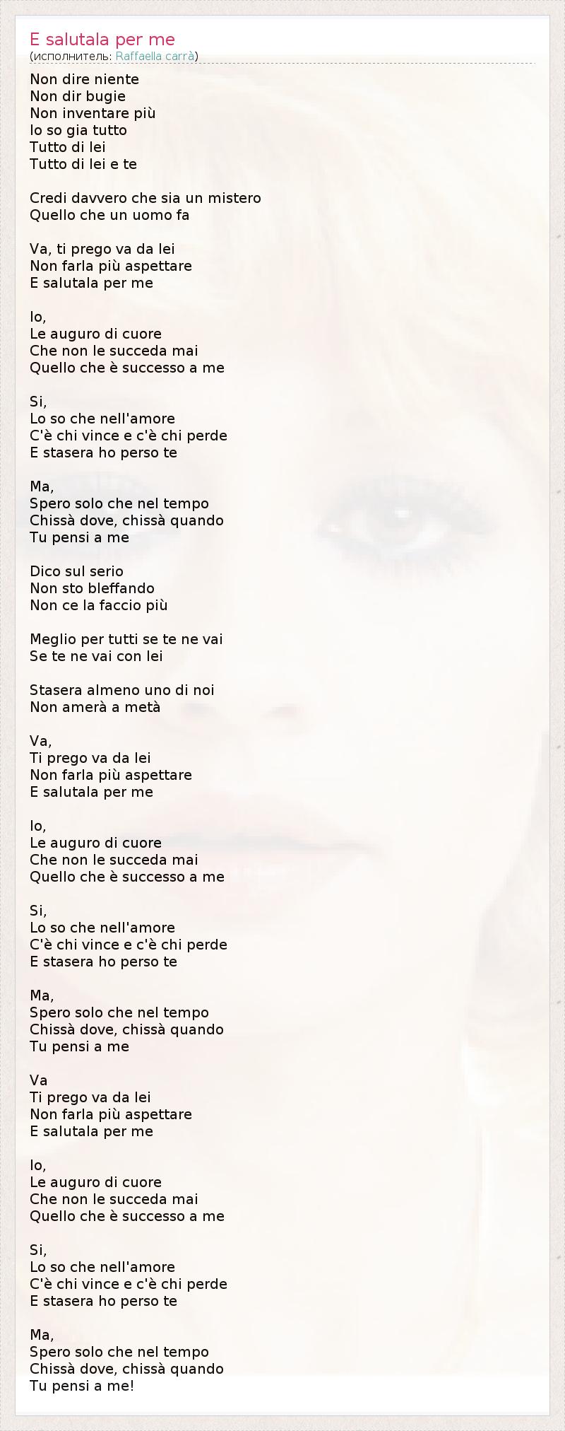 Non dire niente Non dir bugie Non inventare più Io so gia tutto Tutto di lei Tutto di lei e te Credi davvero che sia un mistero Quello che un uomo fa Va, ti prego va da lei Non farla più aspettare E salutala per me Io, Le auguro di cuore Che non le succeda mai Quello che è successo a me Si, Lo so che nell'amore C'è chi vince e c'è chi perde E stasera ho perso te Ma, Spero solo che nel tempo Chissà dove, chissà quando Tu pensi a me Dico sul serio Non sto bleffando Non ce la faccio più Meglio per tutti se te ne vai Se te ne vai con lei Stasera almeno uno di noi Non amerà a metà Va, Ti prego va da lei Non farla più aspettare E salutala per me Io, Le auguro di cuore Che non le succeda mai Quello che è successo a me Si, Lo so che nell'amore C'è chi vince e c'è chi perde E stasera ho perso te Ma, Spero solo che nel tempo Chissà dove, chissà quando Tu pensi a me Va Ti prego va da lei Non farla più aspettare E salutala per me Io, Le auguro di cuore Che non le succeda mai Quello che è successo a me Si, Lo so che nell'amore C'è chi vince e c'è chi perde E stasera ho perso te Ma, Spero solo che nel tempo Chissà dove, chissà quando Tu pensi a me!