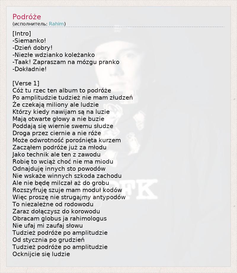 [Intro] -Siemanko! -Dzień dobry! -Niezłe wdzianko koleżanko -Taak! Zapraszam na mózgu pranko -Dokładnie! [Verse 1] Cóż tu rzec ten album to podróże Po amplitudzie tudzież nie mam złudzeń Że czekają miliony ale ludzie Którzy kiedy nawijam są na luzie Mają otwarte głowy a nie buzie Poddają się wiernie swemu słudze Droga przez ciernie a nie róże Może odwrotność porośnięta kurzem Zacząłem podróże już za młodu Jako technik ale ten z zawodu Robię to wciąż choć nie ma miodu Odnajduję innych sto powodów Nie wskaże winnych szkoda zachodu Ale nie będę milczał aż do grobu Rozszyfruję szuje mam moduł kodów Więc proszę nie strugajmy antypodów To niezależne od rodowodu Zaraz dołączysz do korowodu Obracam globus ja rahimologus Nie ufaj mi zaufaj słowu Tudzież podróże po amplitudzie Od stycznia po grudzień Tudzież podróże po amplitudzie Ocknijcie się ludzie