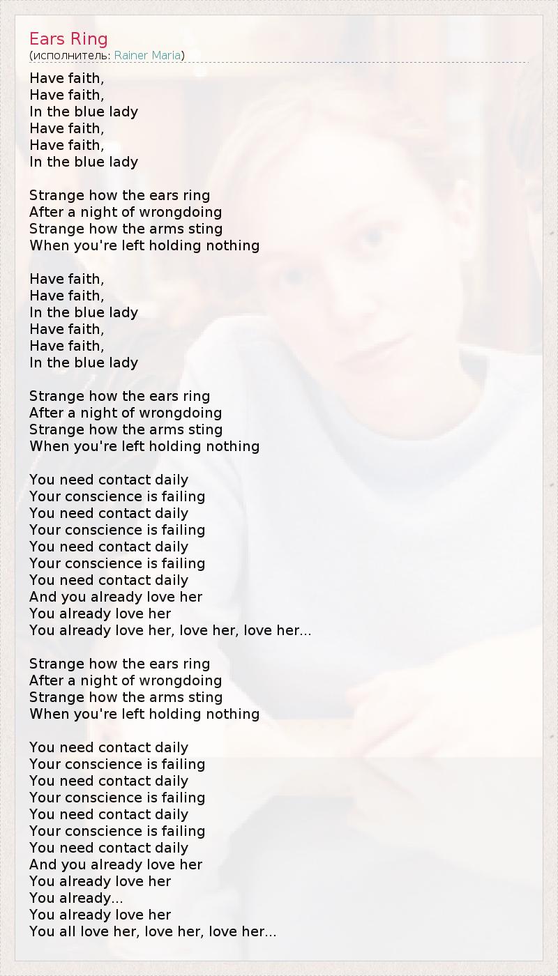 Have faith, Have faith, In the blue lady Have faith, Have faith, In the blue lady Strange how the ears ring After a night of wrongdoing Strange how the arms sting When you're left holding nothing Have faith, Have faith, In the blue lady Have faith, Have faith, In the blue lady Strange how the ears ring After a night of wrongdoing Strange how the arms sting When you're left holding nothing You need contact daily Your conscience is failing You need contact daily Your conscience is failing You need contact daily Your conscience is failing You need contact daily And you already love her You already love her You already love her, love her, love her... Strange how the ears ring After a night of wrongdoing Strange how the arms sting When you're left holding nothing You need contact daily Your conscience is failing You need contact daily Your conscience is failing You need contact daily Your conscience is failing You need contact daily And you already love her You already love her You already... You already love her You all love her, love her, love her...