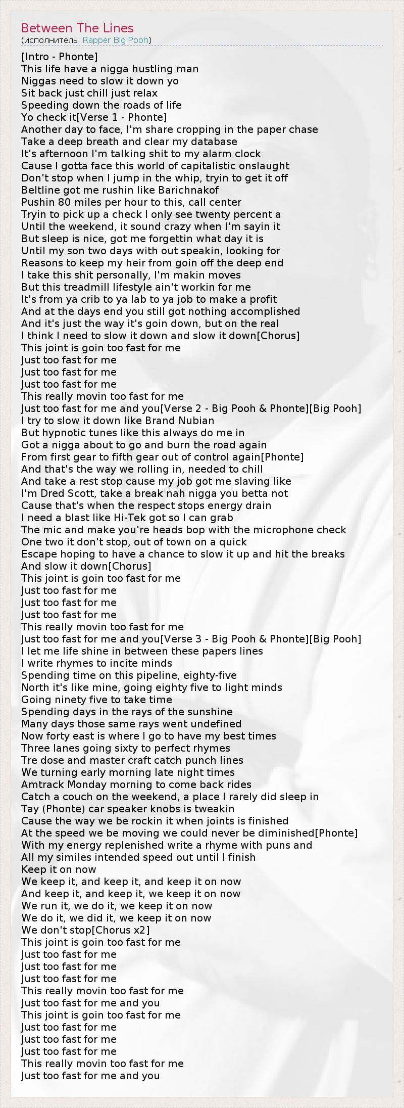 [Intro - Phonte] This life have a nigga hustling man Niggas need to slow it down yo Sit back just chill just relax Speeding down the roads of life Yo check it[Verse 1 - Phonte] Another day to face, I'm share cropping in the paper chase Take a deep breath and clear my database It's afternoon I'm talking shit to my alarm clock Cause I gotta face this world of capitalistic onslaught Don't stop when I jump in the whip, tryin to get it off Beltline got me rushin like Barichnakof Pushin 80 miles per hour to this, call center Tryin to pick up a check I only see twenty percent a Until the weekend, it sound crazy when I'm sayin it But sleep is nice, got me forgettin what day it is Until my son two days with out speakin, looking for Reasons to keep my heir from goin off the deep end I take this shit personally, I'm makin moves But this treadmill lifestyle ain't workin for me It's from ya crib to ya lab to ya job to make a profit And at the days end you still got nothing accomplished And it's just the way it's goin down, but on the real I think I need to slow it down and slow it down[Chorus] This joint is goin too fast for me Just too fast for me Just too fast for me Just too fast for me This really movin too fast for me Just too fast for me and you[Verse 2 - Big Pooh & Phonte][Big Pooh] I try to slow it down like Brand Nubian But hypnotic tunes like this always do me in Got a nigga about to go and burn the road again From first gear to fifth gear out of control again[Phonte] And that's the way we rolling in, needed to chill And take a rest stop cause my job got me slaving like I'm Dred Scott, take a break nah nigga you betta not Cause that's when the respect stops energy drain I need a blast like Hi-Tek got so I can grab The mic and make you're heads bop with the microphone check One two it don't stop, out of town on a quick Escape hoping to have a chance to slow it up and hit the breaks And slow it down[Chorus] This joint is goin too fast for me Just too fast for me Just too fast for me Just too fast for me This really movin too fast for me Just too fast for me and you[Verse 3 - Big Pooh & Phonte][Big Pooh] I let me life shine in between these papers lines I write rhymes to incite minds Spending time on this pipeline, eighty-five North it's like mine, going eighty five to light minds Going ninety five to take time Spending days in the rays of the sunshine Many days those same rays went undefined Now forty east is where I go to have my best times Three lanes going sixty to perfect rhymes Tre dose and master craft catch punch lines We turning early morning late night times Amtrack Monday morning to come back rides Catch a couch on the weekend, a place I rarely did sleep in Tay (Phonte) car speaker knobs is tweakin Cause the way we be rockin it when joints is finished At the speed we be moving we could never be diminished[Phonte] With my energy replenished write a rhyme with puns and All my similes intended speed out until I finish Keep it on now We keep it, and keep it, and keep it on now And keep it, and keep it, we keep it on now We run it, we do it, we keep it on now We do it, we did it, we keep it on now We don't stop[Chorus x2] This joint is goin too fast for me Just too fast for me Just too fast for me Just too fast for me This really movin too fast for me Just too fast for me and you This joint is goin too fast for me Just too fast for me Just too fast for me Just too fast for me This really movin too fast for me Just too fast for me and you