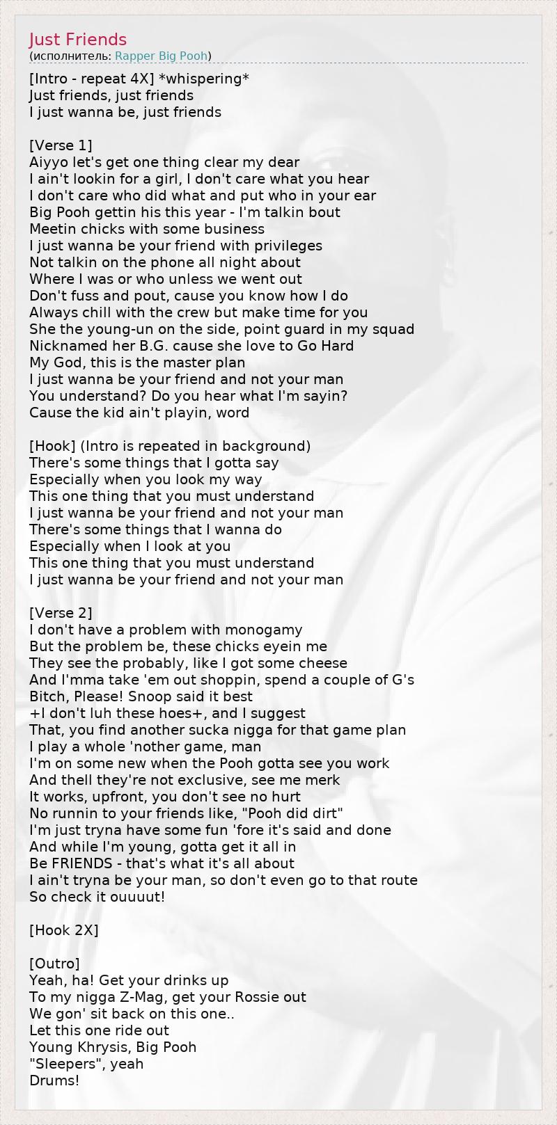 [Intro - repeat 4X] *whispering* Just friends, just friends I just wanna be, just friends [Verse 1] Aiyyo let's get one thing clear my dear I ain't lookin for a girl, I don't care what you hear I don't care who did what and put who in your ear Big Pooh gettin his this year - I'm talkin bout Meetin chicks with some business I just wanna be your friend with privileges Not talkin on the phone all night about Where I was or who unless we went out Don't fuss and pout, cause you know how I do Always chill with the crew but make time for you She the young-un on the side, point guard in my squad Nicknamed her B.G. cause she love to Go Hard My God, this is the master plan I just wanna be your friend and not your man You understand? Do you hear what I'm sayin? Cause the kid ain't playin, word [Hook] (Intro is repeated in background) There's some things that I gotta say Especially when you look my way This one thing that you must understand I just wanna be your friend and not your man There's some things that I wanna do Especially when I look at you This one thing that you must understand I just wanna be your friend and not your man [Verse 2] I don't have a problem with monogamy But the problem be, these chicks eyein me They see the probably, like I got some cheese And I'mma take 'em out shoppin, spend a couple of G's Bitch, Please! Snoop said it best +I don't luh these hoes+, and I suggest That, you find another sucka nigga for that game plan I play a whole 'nother game, man I'm on some new when the Pooh gotta see you work And thell they're not exclusive, see me merk It works, upfront, you don't see no hurt No runnin to your friends like, "Pooh did dirt" I'm just tryna have some fun 'fore it's said and done And while I'm young, gotta get it all in Be FRIENDS - that's what it's all about I ain't tryna be your man, so don't even go to that route So check it ouuuut! [Hook 2X] [Outro] Yeah, ha! Get your drinks up To my nigga Z-Mag, get your Rossie out We gon' sit back on this one.. Let this one ride out Young Khrysis, Big Pooh "Sleepers", yeah Drums!