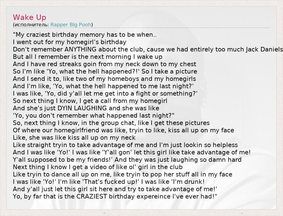 Это интересно:Rapper Big Pooh (born Thomas Jones) is the stage name of an American rapper, who, along with fellow rap artist Phonte, was a member of the acclaimed North Carolina hip hop group Little Brother. In addition to numerous records and EP's by Little Brother, Pooh released a solo album in 2005 entitled Sleepers to positive critical review. Furthermore, he has been guest featured on numerous tracks by other artists. Big Pooh also appreciates basketball and has served as a guest writer on a basketball blog.Rapper Big Pooh first got his break by Beni B of ABB Records. He had been pursued by most of the major labels for about a year. He ended up signing to Atlantic "because the independent... продолжение