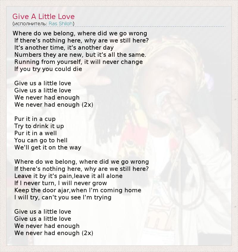 Where do we belong, where did we go wrong If there's nothing here, why are we still here? It's another time, it's another day Numbers they are new, but it's all the same. Running from yourself, it will never change If you try you could die Give us a little love Give us a little love We never had enough We never had enough (2x) Pur it in a cup Try to drink it up Pur it in a well You can go to hell We'll get it on the way Where do we belong, where did we go wrong If there's nothing here, why are we still here? Leave it by it's pain,leave it all alone If I never turn, I will never grow Keep the door ajar,when I'm coming home I will try, can't you see I'm trying Give us a little love Give us a little love We never had enough We never had enough (2x)