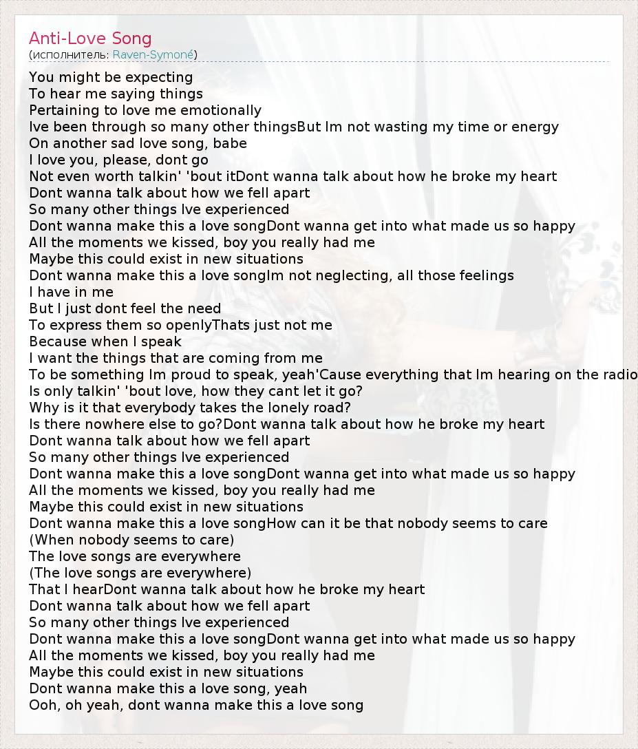 You might be expecting To hear me saying things Pertaining to love me emotionally Ive been through so many other thingsBut Im not wasting my time or energy On another sad love song, babe I love you, please, dont go Not even worth talkin' 'bout itDont wanna talk about how he broke my heart Dont wanna talk about how we fell apart So many other things Ive experienced Dont wanna make this a love songDont wanna get into what made us so happy All the moments we kissed, boy you really had me Maybe this could exist in new situations Dont wanna make this a love songIm not neglecting, all those feelings I have in me But I just dont feel the need To express them so openlyThats just not me Because when I speak I want the things that are coming from me To be something Im proud to speak, yeah'Cause everything that Im hearing on the radio Is only talkin' 'bout love, how they cant let it go? Why is it that everybody takes the lonely road? Is there nowhere else to go?Dont wanna talk about how he broke my heart Dont wanna talk about how we fell apart So many other things Ive experienced Dont wanna make this a love songDont wanna get into what made us so happy All the moments we kissed, boy you really had me Maybe this could exist in new situations Dont wanna make this a love songHow can it be that nobody seems to care (When nobody seems to care) The love songs are everywhere (The love songs are everywhere) That I hearDont wanna talk about how he broke my heart Dont wanna talk about how we fell apart So many other things Ive experienced Dont wanna make this a love songDont wanna get into what made us so happy All the moments we kissed, boy you really had me Maybe this could exist in new situations Dont wanna make this a love song, yeah Ooh, oh yeah, dont wanna make this a love song