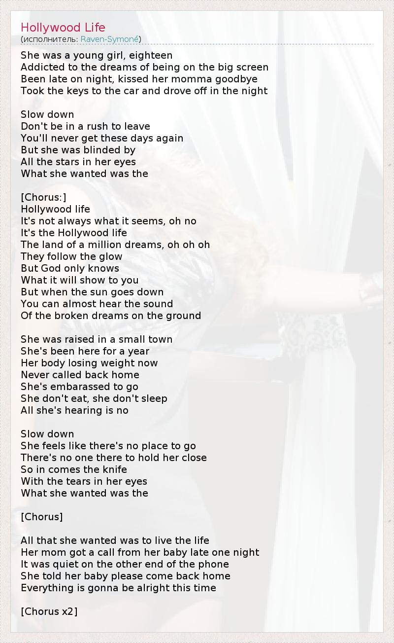 She was a young girl, eighteen Addicted to the dreams of being on the big screen Been late on night, kissed her momma goodbye Took the keys to the car and drove off in the night Slow down Don't be in a rush to leave You'll never get these days again But she was blinded by All the stars in her eyes What she wanted was the [Chorus:] Hollywood life It's not always what it seems, oh no It's the Hollywood life The land of a million dreams, oh oh oh They follow the glow But God only knows What it will show to you But when the sun goes down You can almost hear the sound Of the broken dreams on the ground She was raised in a small town She's been here for a year Her body losing weight now Never called back home She's embarassed to go She don't eat, she don't sleep All she's hearing is no Slow down She feels like there's no place to go There's no one there to hold her close So in comes the knife With the tears in her eyes What she wanted was the [Chorus] All that she wanted was to live the life Her mom got a call from her baby late one night It was quiet on the other end of the phone She told her baby please come back home Everything is gonna be alright this time [Chorus x2]