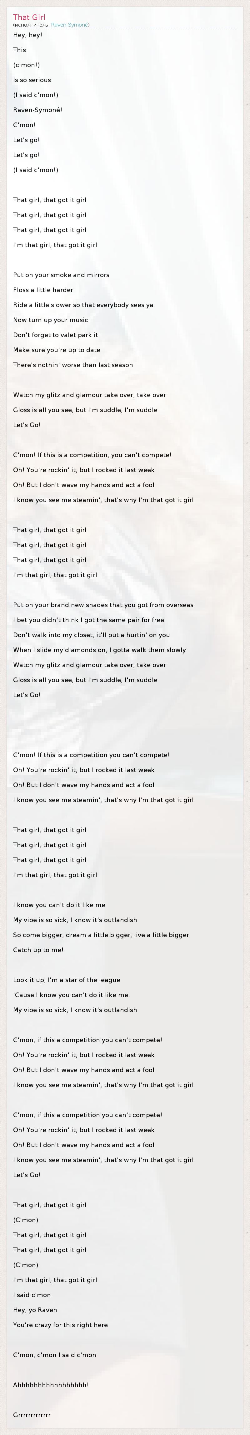 Hey, hey! This (c'mon!) Is so serious (I said c'mon!) Raven-Symoné! C'mon! Let's go! Let's go! (I said c'mon!) That girl, that got it girl That girl, that got it girl That girl, that got it girl I'm that girl, that got it girl Put on your smoke and mirrors Floss a little harder Ride a little slower so that everybody sees ya Now turn up your music Don't forget to valet park it Make sure you're up to date There's nothin' worse than last season Watch my glitz and glamour take over, take over Gloss is all you see, but I'm suddle, I'm suddle Let's Go! C'mon! If this is a competition, you can't compete! Oh! You're rockin' it, but I rocked it last week Oh! But I don't wave my hands and act a fool I know you see me steamin', that's why I'm that got it girl That girl, that got it girl That girl, that got it girl That girl, that got it girl I'm that girl, that got it girl Put on your brand new shades that you got from overseas I bet you didn't think I got the same pair for free Don't walk into my closet, it'll put a hurtin' on you When I slide my diamonds on, I gotta walk them slowly Watch my glitz and glamour take over, take over Gloss is all you see, but I'm suddle, I'm suddle Let's Go! C'mon! If this is a competition you can't compete! Oh! You're rockin' it, but I rocked it last week Oh! But I don't wave my hands and act a fool I know you see me steamin', that's why I'm that got it girl That girl, that got it girl That girl, that got it girl That girl, that got it girl I'm that girl, that got it girl I know you can't do it like me My vibe is so sick, I know it's outlandish So come bigger, dream a little bigger, live a little bigger Catch up to me! Look it up, I'm a star of the league 'Cause I know you can't do it like me My vibe is so sick, I know it's outlandish C'mon, if this a competition you can't compete! Oh! You're rockin' it, but I rocked it last week Oh! But I don't wave my hands and act a fool I know you see me steamin', that's why I'm that got it girl C'mon, if this a competition you can't compete! Oh! You're rockin' it, but I rocked it last week Oh! But I don't wave my hands and act a fool I know you see me steamin', that's why I'm that got it girl Let's Go! That girl, that got it girl (C'mon) That girl, that got it girl That girl, that got it girl (C'mon) I'm that girl, that got it girl I said c'mon Hey, yo Raven You're crazy for this right here C'mon, c'mon I said c'mon Ahhhhhhhhhhhhhhhhh! Grrrrrrrrrrrrr
