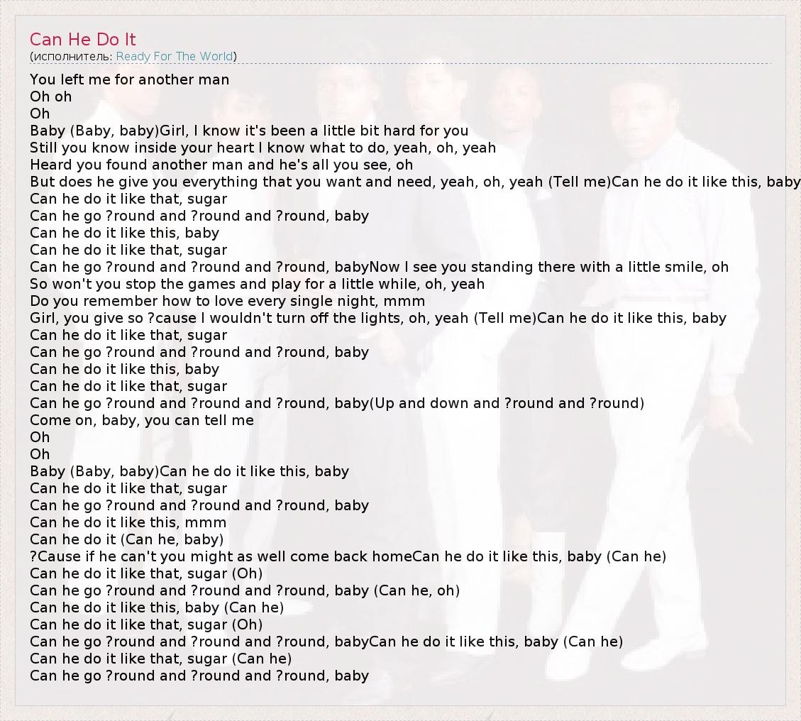You left me for another man Oh oh Oh Baby (Baby, baby)Girl, I know it's been a little bit hard for you Still you know inside your heart I know what to do, yeah, oh, yeah Heard you found another man and he's all you see, oh But does he give you everything that you want and need, yeah, oh, yeah (Tell me)Can he do it like this, baby Can he do it like that, sugar Can he go ?round and ?round and ?round, baby Can he do it like this, baby Can he do it like that, sugar Can he go ?round and ?round and ?round, babyNow I see you standing there with a little smile, oh So won't you stop the games and play for a little while, oh, yeah Do you remember how to love every single night, mmm Girl, you give so ?cause I wouldn't turn off the lights, oh, yeah (Tell me)Can he do it like this, baby Can he do it like that, sugar Can he go ?round and ?round and ?round, baby Can he do it like this, baby Can he do it like that, sugar Can he go ?round and ?round and ?round, baby(Up and down and ?round and ?round) Come on, baby, you can tell me Oh Oh Baby (Baby, baby)Can he do it like this, baby Can he do it like that, sugar Can he go ?round and ?round and ?round, baby Can he do it like this, mmm Can he do it (Can he, baby) ?Cause if he can't you might as well come back homeCan he do it like this, baby (Can he) Can he do it like that, sugar (Oh) Can he go ?round and ?round and ?round, baby (Can he, oh) Can he do it like this, baby (Can he) Can he do it like that, sugar (Oh) Can he go ?round and ?round and ?round, babyCan he do it like this, baby (Can he) Can he do it like that, sugar (Can he) Can he go ?round and ?round and ?round, baby