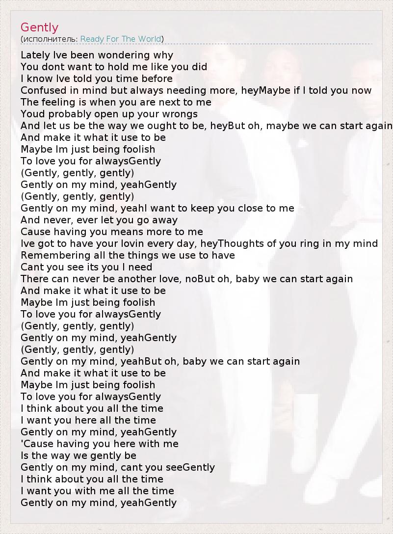 Lately Ive been wondering why You dont want to hold me like you did I know Ive told you time before Confused in mind but always needing more, heyMaybe if I told you now The feeling is when you are next to me Youd probably open up your wrongs And let us be the way we ought to be, heyBut oh, maybe we can start again And make it what it use to be Maybe Im just being foolish To love you for alwaysGently (Gently, gently, gently) Gently on my mind, yeahGently (Gently, gently, gently) Gently on my mind, yeahI want to keep you close to me And never, ever let you go away Cause having you means more to me Ive got to have your lovin every day, heyThoughts of you ring in my mind Remembering all the things we use to have Cant you see its you I need There can never be another love, noBut oh, baby we can start again And make it what it use to be Maybe Im just being foolish To love you for alwaysGently (Gently, gently, gently) Gently on my mind, yeahGently (Gently, gently, gently) Gently on my mind, yeahBut oh, baby we can start again And make it what it use to be Maybe Im just being foolish To love you for alwaysGently I think about you all the time I want you here all the time Gently on my mind, yeahGently 'Cause having you here with me Is the way we gently be Gently on my mind, cant you seeGently I think about you all the time I want you with me all the time Gently on my mind, yeahGently