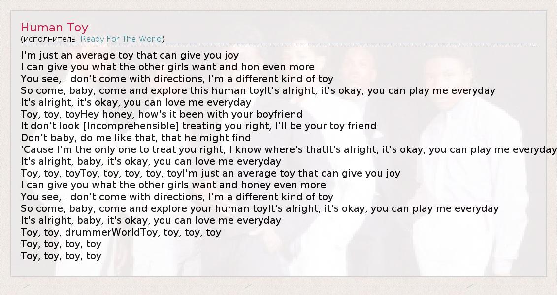 I'm just an average toy that can give you joy I can give you what the other girls want and hon even more You see, I don't come with directions, I'm a different kind of toy So come, baby, come and explore this human toyIt's alright, it's okay, you can play me everyday It's alright, it's okay, you can love me everyday Toy, toy, toyHey honey, how's it been with your boyfriend It don't look [Incomprehensible] treating you right, I'll be your toy friend Don't baby, do me like that, that he might find 'Cause I'm the only one to treat you right, I know where's thatIt's alright, it's okay, you can play me everyday It's alright, baby, it's okay, you can love me everyday Toy, toy, toyToy, toy, toy, toy, toyI'm just an average toy that can give you joy I can give you what the other girls want and honey even more You see, I don't come with directions, I'm a different kind of toy So come, baby, come and explore your human toyIt's alright, it's okay, you can play me everyday It's alright, baby, it's okay, you can love me everyday Toy, toy, drummerWorldToy, toy, toy, toy Toy, toy, toy, toy Toy, toy, toy, toy