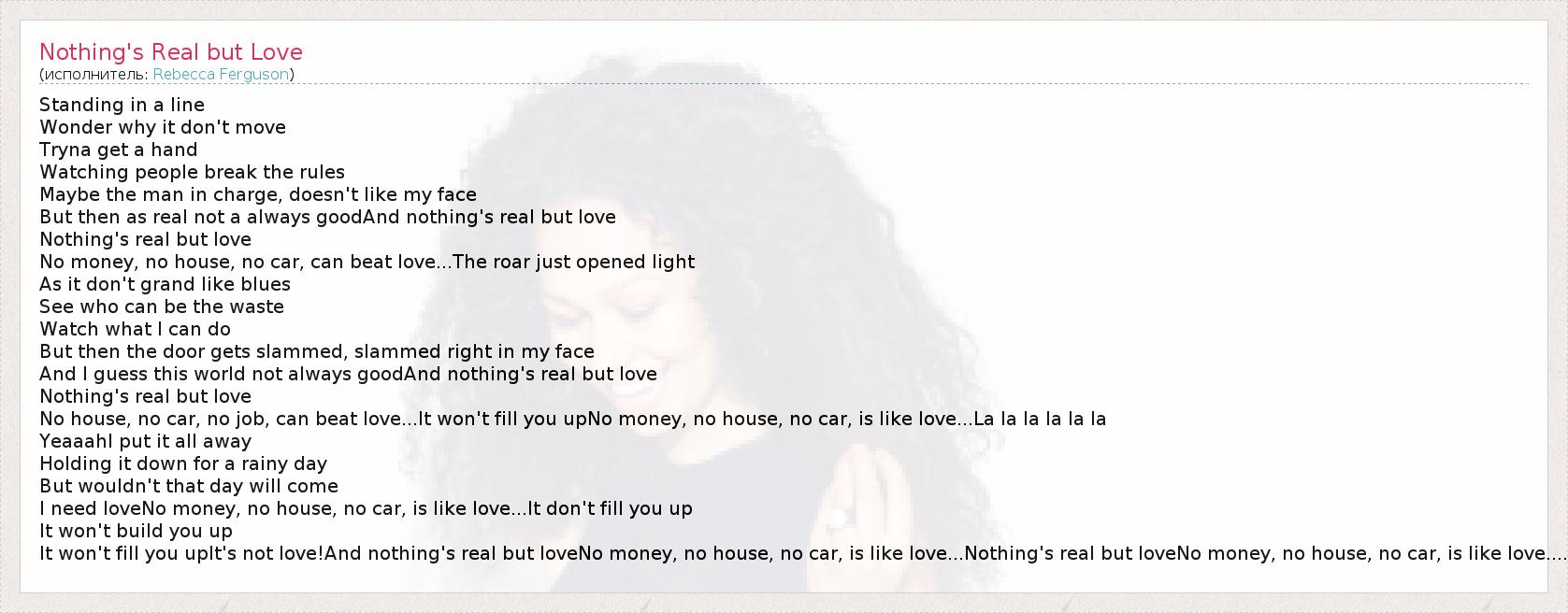 Standing in a line Wonder why it don't move Tryna get a hand Watching people break the rules Maybe the man in charge, doesn't like my face But then as real not a always goodAnd nothing's real but love Nothing's real but love No money, no house, no car, can beat love...The roar just opened light As it don't grand like blues See who can be the waste Watch what I can do But then the door gets slammed, slammed right in my face And I guess this world not always goodAnd nothing's real but love Nothing's real but love No house, no car, no job, can beat love...It won't fill you upNo money, no house, no car, is like love...La la la la la la YeaaahI put it all away Holding it down for a rainy day But wouldn't that day will come I need loveNo money, no house, no car, is like love...It don't fill you up It won't build you up It won't fill you upIt's not love!And nothing's real but loveNo money, no house, no car, is like love...Nothing's real but loveNo money, no house, no car, is like love....