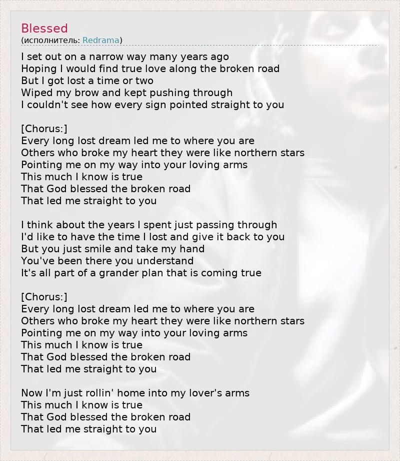 Я ступил на узкую тропу много лет назад, Надеясь, что найду настоящую любовь на извилистом пути. Но я заблудился, раз или два, Расшиб лоб и продолжал пробиваться. Я не мог понять, что каждый знак указывал мне прямо на тебя. [Припев:] Каждая давно забытая мечта вела меня туда, где ты. Те, кто разбили мне сердце, они были как северные звезды, Указывающие путь в твои любящие руки. Я знаю точно, Господь благословил эту извилистую дорогу, Что привела меня прямо к тебе. Я думаю о тех годах, что потратил зря, Хотел бы я всё это потерянное время вернуть тебе. Но ты просто улыбаешься и берёшь меня за руку. Ты всё видела, ты понимаешь, Всё это – часть большого плана, который сбывается. [Припев:] Каждая давно забытая мечта вела меня туда, где ты. Те, кто разбили мне сердце, они были как северные звезды, Указывающие путь в твои любящие руки. Я знаю точно, Господь благословил эту извилистую дорогу, Что привела меня прямо к тебе. Теперь я просто еду домой в руки моей любимой. Я знаю точно, Господь благословил эту извилистую дорогу, Что привела меня прямо к тебе.