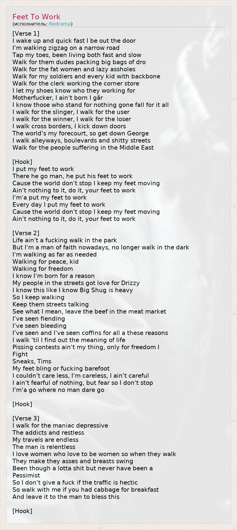 А как ты думаешь, о чем песня "Feet To Work" ?