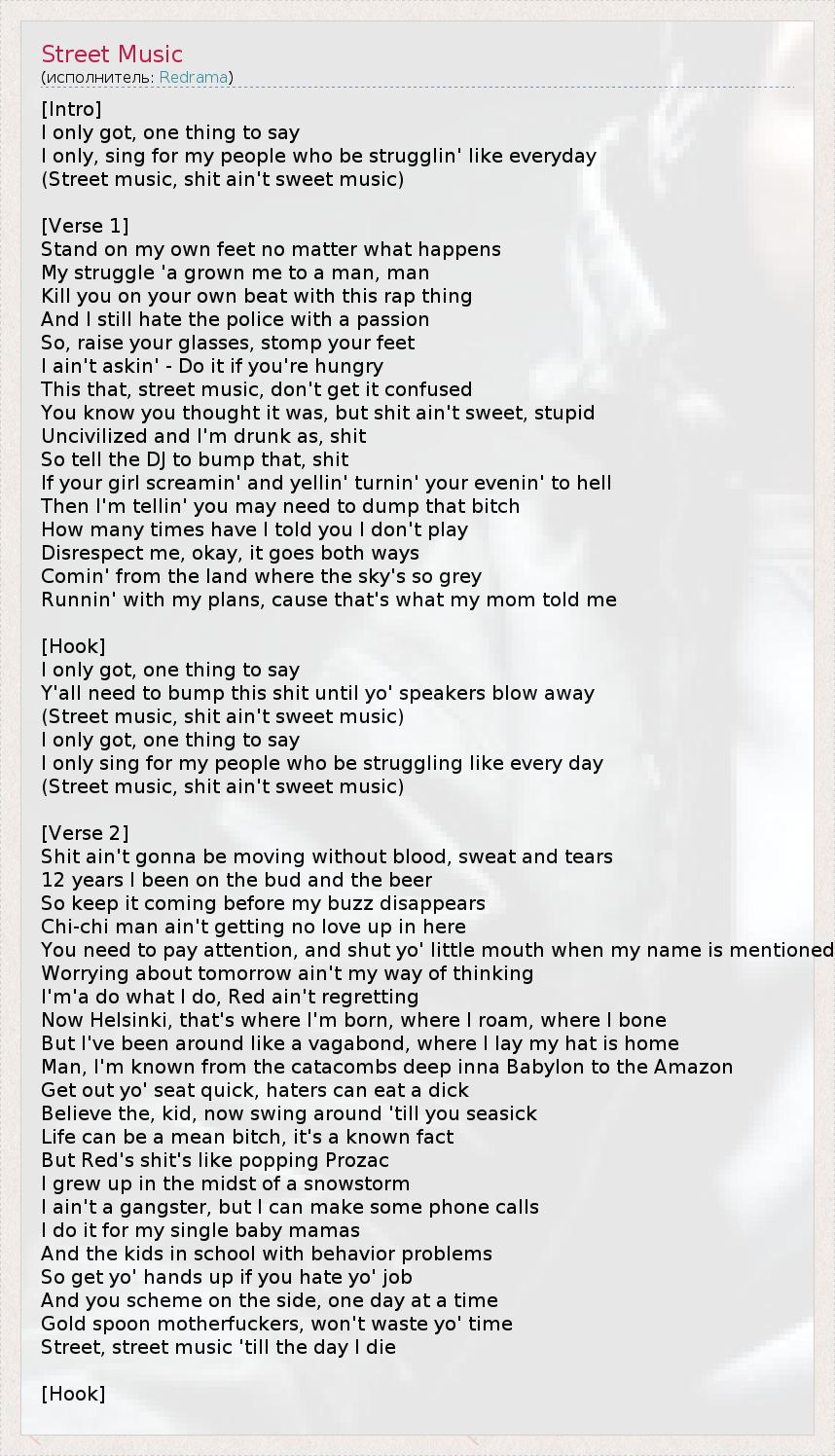Это интересно:Lasse Mellberg (born 1977 Helsinki, Finland), better known by his stage name Redrama, is a Finland-Swedish rapper. Redrama made a breakthrough in 2003. English occurring Redrama was part of hip-hop group Alien Allies, which also included the Norwegian Paperboys and Madcon. Redrama won the English-language Finnish championship of rapping in 2001. He won the finnish Grammy (Emma) award for best hiphop album in 2005. He's worked together with such artists as Madcon(Nor), Proof (of D12), Promoe, Pato Pooh (Swe), Anna Abreu, Asa, Paleface, Felix Zenger to name a few.