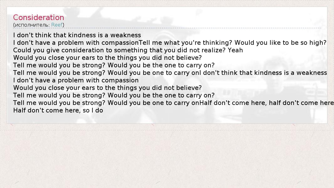 Это интересно:Четверо музыкантов, основавших эту команду, выросли в окрестностях Гластонбери. Гэри Стрингер и Джек Бессант были соседями и вместе начинали музицировать в одной фанк-хардкор-кавер-банде. К 1992 году они вместе с Кенвином Хаусом и Домиником Гринсмитом перебрались в Лондон, где играли всякие вещи Джими Хендрикса, "Massive attack", "Jane's addiction". Постепенно "REEF" перешли на современную... продолжение