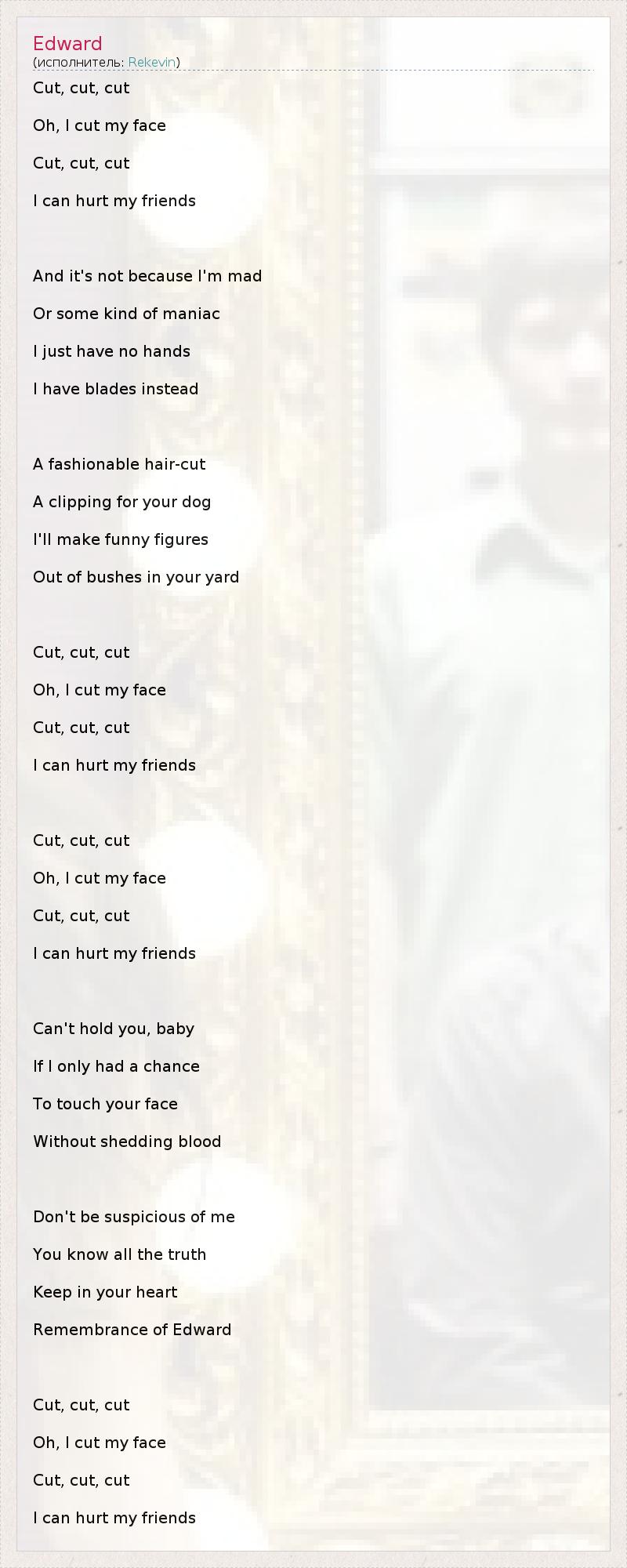 Cut, cut, cut Oh, I cut my face Cut, cut, cut I can hurt my friends And it's not because I'm mad Or some kind of maniac I just have no hands I have blades instead A fashionable hair-cut A clipping for your dog I'll make funny figures Out of bushes in your yard Cut, cut, cut Oh, I cut my face Cut, cut, cut I can hurt my friends Cut, cut, cut Oh, I cut my face Cut, cut, cut I can hurt my friends Can't hold you, baby If I only had a chance To touch your face Without shedding blood Don't be suspicious of me You know all the truth Keep in your heart Remembrance of Edward Cut, cut, cut Oh, I cut my face Cut, cut, cut I can hurt my friends