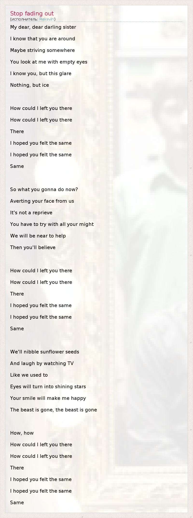 My dear, dear darling sister I know that you are around Maybe striving somewhere You look at me with empty eyes I know you, but this glare Nothing, but ice How could I left you there How could I left you there There I hoped you felt the same I hoped you felt the same Same So what you gonna do now? Averting your face from us It's not a reprieve You have to try with all your might We will be near to help Then you'll believe How could I left you there How could I left you there There I hoped you felt the same I hoped you felt the same Same We'll nibble sunflower seeds And laugh by watching TV Like we used to Eyes will turn into shining stars Your smile will make me happy The beast is gone, the beast is gone How, how How could I left you there How could I left you there There I hoped you felt the same I hoped you felt the same Same