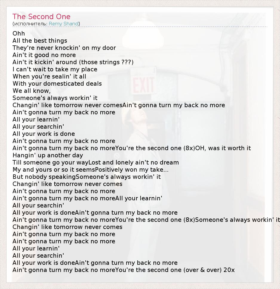 Ohh All the best things They're never knockin' on my door Ain't it good no more Ain't it kickin' around (those strings ???) I can't wait to take my place When you're sealin' it all With your domesticated deals We all know, Someone's always workin' it Changin' like tomorrow never comesAin't gonna turn my back no more Ain't gonna turn my back no more All your learnin' All your searchin' All your work is done Ain't gonna turn my back no more Ain't gonna turn my back no moreYou're the second one (8x)OH, was it worth it Hangin' up another day Till someone go your wayLost and lonely ain't no dream My and yours or so it seemsPositively won my take... But nobody speakingSomeone's always workin' it Changin' like tomorrow never comes Ain't gonna turn my back no more Ain't gonna turn my back no moreAll your learnin' All your searchin' All your work is doneAin't gonna turn my back no more Ain't gonna turn my back no moreYou're the second one (8x)Someone's always workin' it Changin' like tomorrow never comes Ain't gonna turn my back no more Ain't gonna turn my back no more All your learnin' All your searchin' All your work is doneAin't gonna turn my back no more Ain't gonna turn my back no moreYou're the second one (over & over) 20x