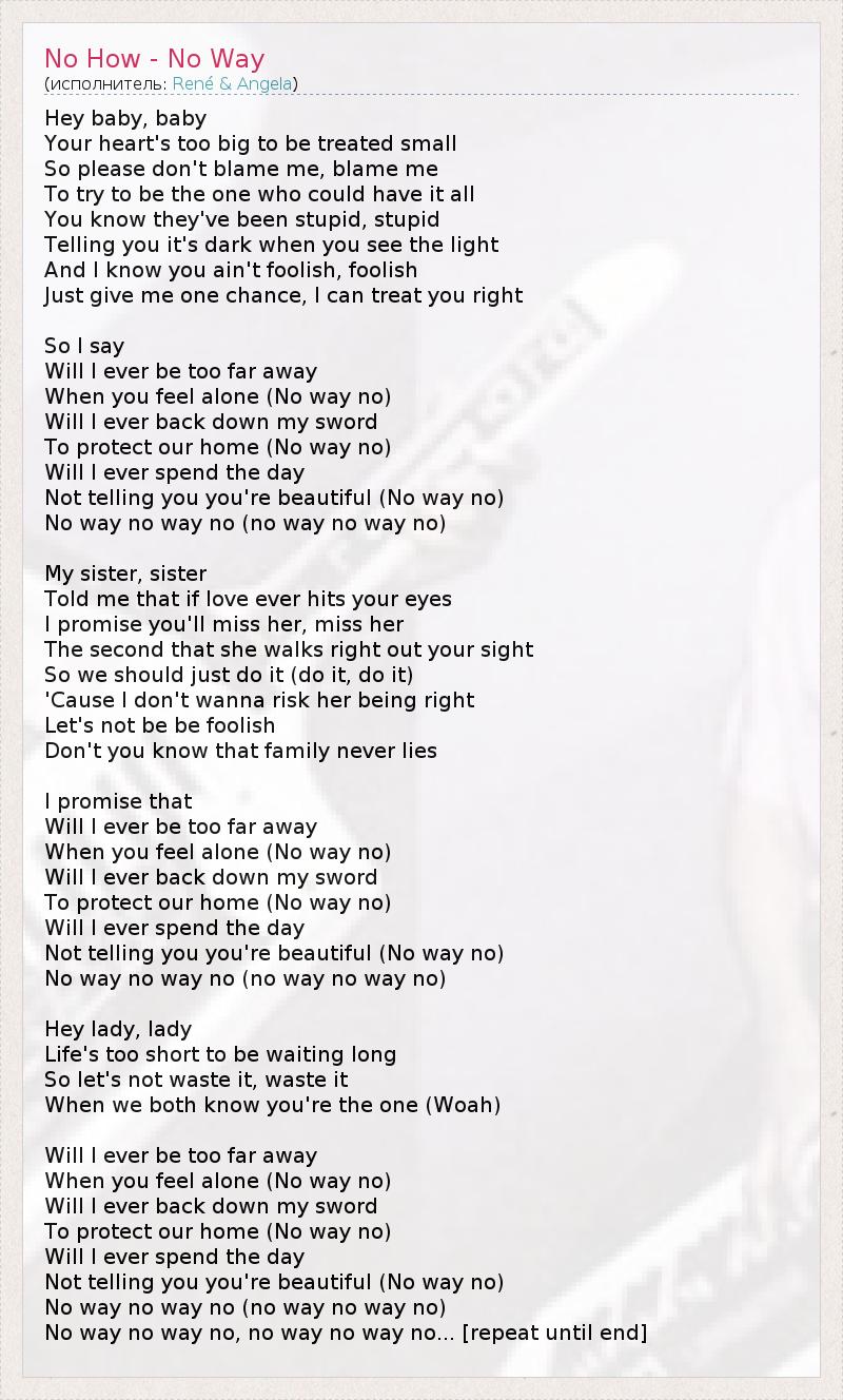 Hey baby, baby Your heart's too big to be treated small So please don't blame me, blame me To try to be the one who could have it all You know they've been stupid, stupid Telling you it's dark when you see the light And I know you ain't foolish, foolish Just give me one chance, I can treat you right So I say Will I ever be too far away When you feel alone (No way no) Will I ever back down my sword To protect our home (No way no) Will I ever spend the day Not telling you you're beautiful (No way no) No way no way no (no way no way no) My sister, sister Told me that if love ever hits your eyes I promise you'll miss her, miss her The second that she walks right out your sight So we should just do it (do it, do it) 'Cause I don't wanna risk her being right Let's not be be foolish Don't you know that family never lies I promise that Will I ever be too far away When you feel alone (No way no) Will I ever back down my sword To protect our home (No way no) Will I ever spend the day Not telling you you're beautiful (No way no) No way no way no (no way no way no) Hey lady, lady Life's too short to be waiting long So let's not waste it, waste it When we both know you're the one (Woah) Will I ever be too far away When you feel alone (No way no) Will I ever back down my sword To protect our home (No way no) Will I ever spend the day Not telling you you're beautiful (No way no) No way no way no (no way no way no) No way no way no, no way no way no... [repeat until end]