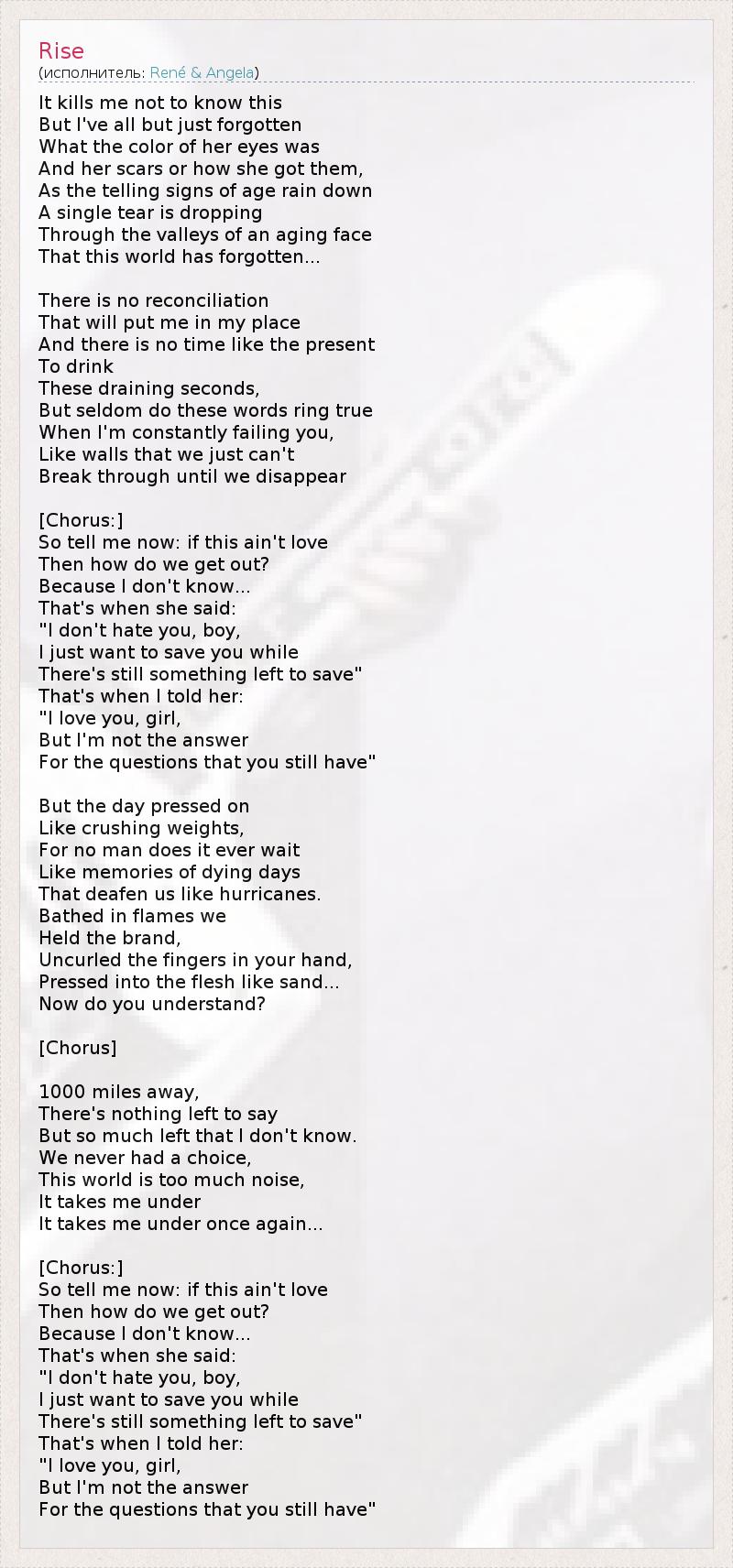Незнание убивает меня, Но я напрочь забыл Цвет ее глаз, Все ее шрамы и истории, стоящие за каждым из них. Под ливнем красноречивых признаков возраста Единственная слезинка стекает По долинам стареющего лица, Забытого всем миром... Никакое примирение Не расставит все по местам, И нет лучшего момента, чем сейчас, Чтобы пригубить бокал По секундам утекающего времени, Но редко ясна справедливость этих слов, Ведь я постоянно подвожу тебя, Кажется, стену между нами не проломить, Пока мы не исчезнем вовсе... [Припев:] Так ответь мне: если это не любовь, То как нам найти выход? Ведь я не знаю... Тогда она сказала: "Я не ненавижу тебя, мальчик мой, Я просто хочу спасти тебя, Пока есть еще кого спасать". Тогда я сказал ей: "Я люблю тебя, девочка моя, Но во мне ты не найдешь ответов На вопросы, что все еще мучают тебя". Но время шло и давило на нас, Словно прогибаясь под собственным весом, Время никогда никого не ждет, Как и воспоминания об уходящих днях, Что оглушают нас, как ураганы. В языках пламени каждый из нас все еще Старался сохранить лицо, Но я разжал пальцы твоей руки, Впившиеся в кожу, как острые песчинки, И спросил: "Теперь ты понимаешь?" [Припев] Мы на расстоянии тысячи миль, И вроде бы все сказано, Но знаю я по-прежнему далеко не все. У нас никогда не было выбора, Этот мир - просто куча звуковых помех, И он пытается подавить меня, Пытается подавить меня снова... [Припев:] Так ответь мне: если это не любовь, То как нам найти выход? Ведь я не знаю... Тогда она сказала: "Я не ненавижу тебя, мальчик мой, Я просто хочу спасти тебя, Пока есть еще кого спасать". Тогда я сказал ей: "Я люблю тебя, девочка моя, Но во мне ты не найдешь ответов На вопросы, что все еще мучают тебя".