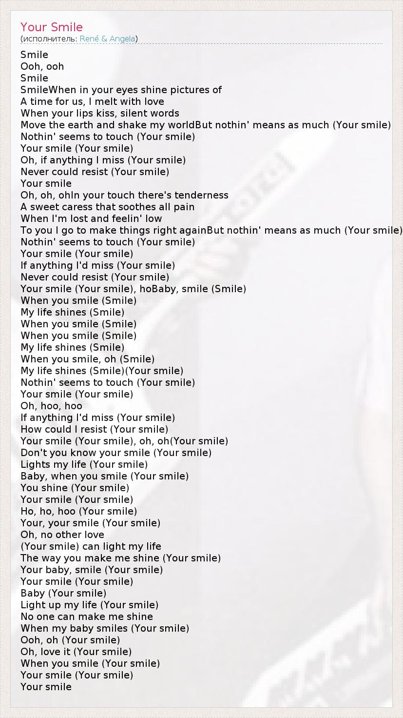 Smile Ooh, ooh Smile SmileWhen in your eyes shine pictures of A time for us, I melt with love When your lips kiss, silent words Move the earth and shake my worldBut nothin' means as much (Your smile) Nothin' seems to touch (Your smile) Your smile (Your smile) Oh, if anything I miss (Your smile) Never could resist (Your smile) Your smile Oh, oh, ohIn your touch there's tenderness A sweet caress that soothes all pain When I'm lost and feelin' low To you I go to make things right againBut nothin' means as much (Your smile) Nothin' seems to touch (Your smile) Your smile (Your smile) If anything I'd miss (Your smile) Never could resist (Your smile) Your smile (Your smile), hoBaby, smile (Smile) When you smile (Smile) My life shines (Smile) When you smile (Smile) When you smile (Smile) My life shines (Smile) When you smile, oh (Smile) My life shines (Smile)(Your smile) Nothin' seems to touch (Your smile) Your smile (Your smile) Oh, hoo, hoo If anything I'd miss (Your smile) How could I resist (Your smile) Your smile (Your smile), oh, oh(Your smile) Don't you know your smile (Your smile) Lights my life (Your smile) Baby, when you smile (Your smile) You shine (Your smile) Your smile (Your smile) Ho, ho, hoo (Your smile) Your, your smile (Your smile) Oh, no other love (Your smile) can light my life The way you make me shine (Your smile) Your baby, smile (Your smile) Your smile (Your smile) Baby (Your smile) Light up my life (Your smile) No one can make me shine When my baby smiles (Your smile) Ooh, oh (Your smile) Oh, love it (Your smile) When you smile (Your smile) Your smile (Your smile) Your smile