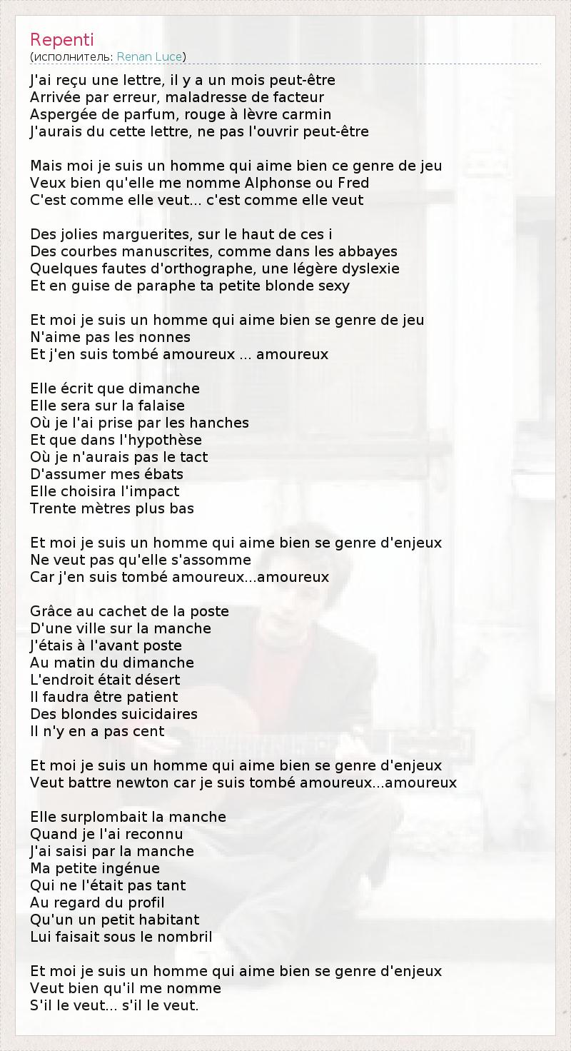 Это интересно:Renan Luce (родился 5 марта 1980 в Париже) является французским певцом и поэтом из Brittany. Его песни вдохновлены автором-исполнителем 20-ого столетия Georges Brassens и изображают повседневную жизнь с толикой юмора и поэзии. Биография и музыкальная карьера. Хотя Renan Luce родился в Париже, все свое детство и юность провел в Plourin-les-Morlaix, Brittany (около Morlaix, в Finistere). Его музыкальная карьера началась с участия... продолжение