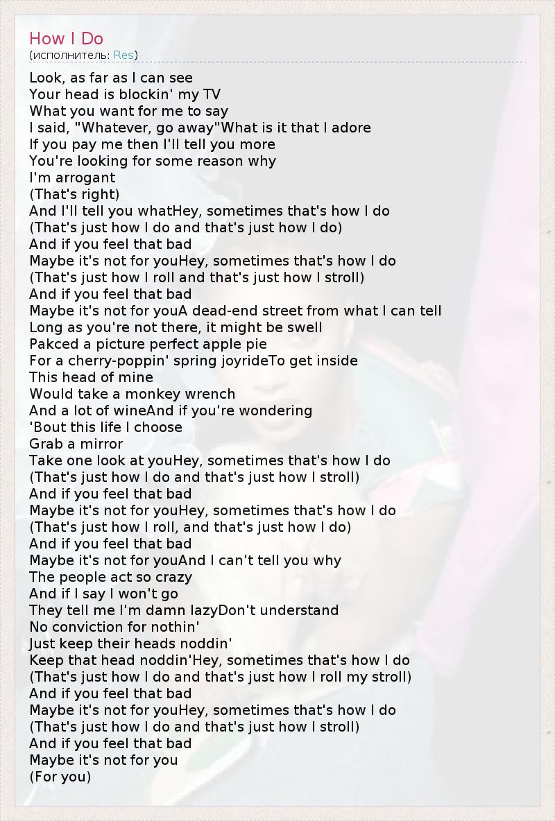 Look, as far as I can see Your head is blockin' my TV What you want for me to say I said, "Whatever, go away"What is it that I adore If you pay me then I'll tell you more You're looking for some reason why I'm arrogant (That's right) And I'll tell you whatHey, sometimes that's how I do (That's just how I do and that's just how I do) And if you feel that bad Maybe it's not for youHey, sometimes that's how I do (That's just how I roll and that's just how I stroll) And if you feel that bad Maybe it's not for youA dead-end street from what I can tell Long as you're not there, it might be swell Pakced a picture perfect apple pie For a cherry-poppin' spring joyrideTo get inside This head of mine Would take a monkey wrench And a lot of wineAnd if you're wondering 'Bout this life I choose Grab a mirror Take one look at youHey, sometimes that's how I do (That's just how I do and that's just how I stroll) And if you feel that bad Maybe it's not for youHey, sometimes that's how I do (That's just how I roll, and that's just how I do) And if you feel that bad Maybe it's not for youAnd I can't tell you why The people act so crazy And if I say I won't go They tell me I'm damn lazyDon't understand No conviction for nothin' Just keep their heads noddin' Keep that head noddin'Hey, sometimes that's how I do (That's just how I do and that's just how I roll my stroll) And if you feel that bad Maybe it's not for youHey, sometimes that's how I do (That's just how I do and that's just how I stroll) And if you feel that bad Maybe it's not for you (For you)