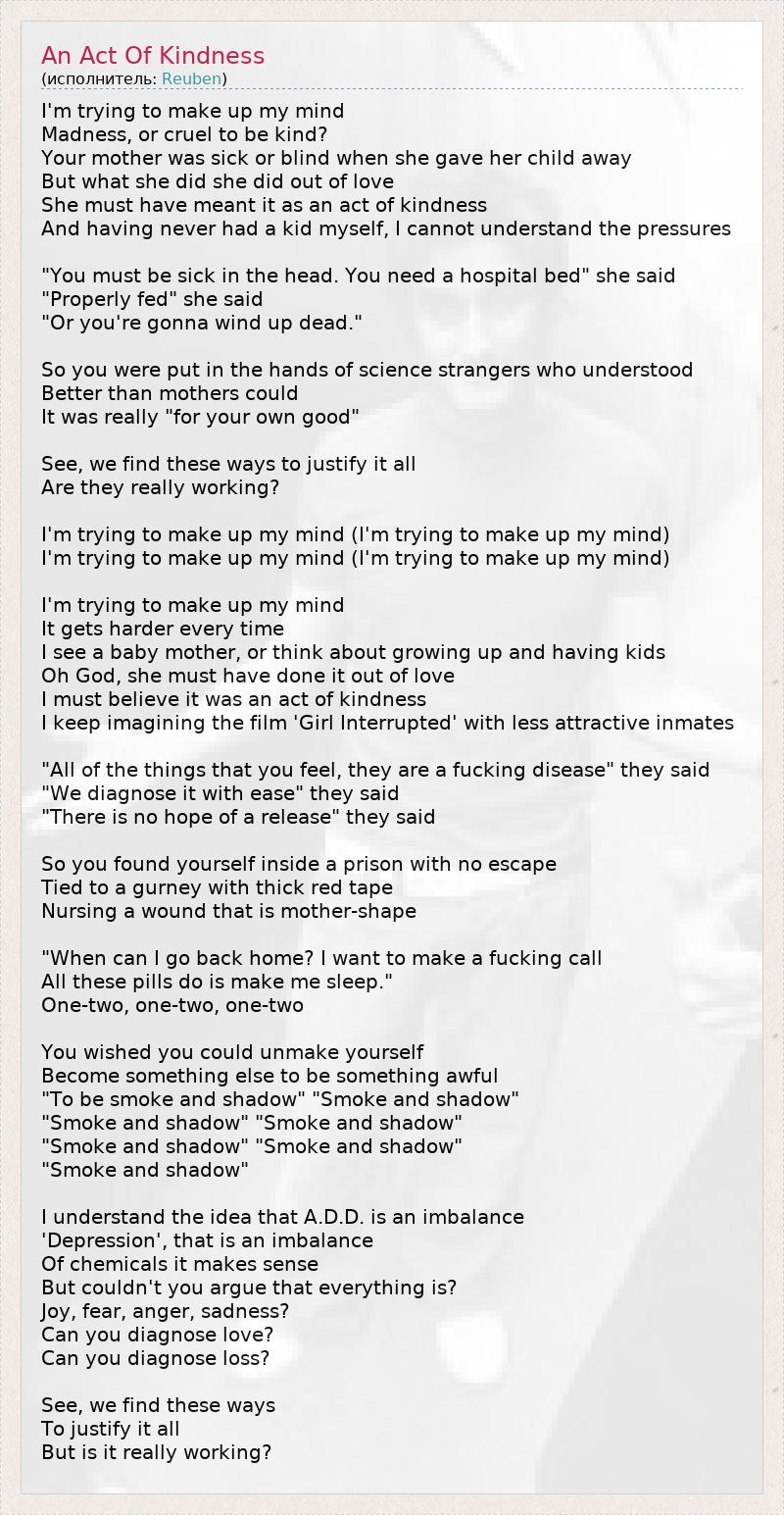А как ты думаешь, о чем песня "An Act Of Kindness" ?