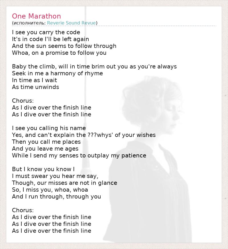 I see you carry the code It's in code I'll be left again And the sun seems to follow through Whoa, on a promise to follow you Baby the climb, will in time brim out you as you're always Seek in me a harmony of rhyme In time as I wait As time unwinds Chorus: As I dive over the finish line As I dive over the finish line I see you calling his name Yes, and can't explain the ???whys' of your wishes Then you call me places And you leave me ages While I send my senses to outplay my patience But I know you know I I must swear you hear me say, Though, our misses are not in glance So, I miss you, whoa, whoa And I run through, through you Chorus: As I dive over the finish line As I dive over the finish line As I dive over the finish line