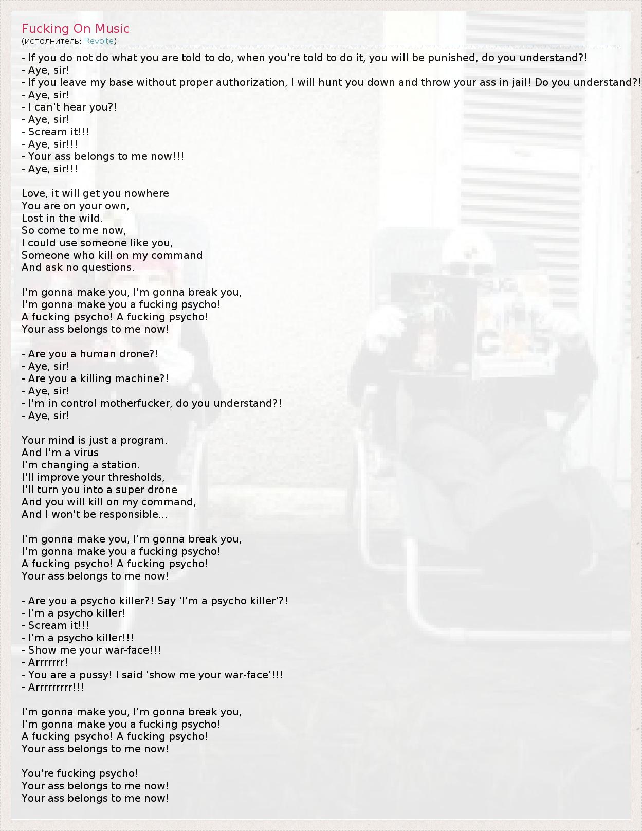 - Если ты не делаешь, что тебе говорят, когда тебе говорят, то ты будешь наказан! Тебе понятно?! - Да, сэр! - Если ты покинешь часть без надлежащего разрешения, я выслежу тебя и упеку твою зад**цу в тюрьму! Тебе понятно?! - Да, сэр! - Не слышу тебя! - Да, сэр! - Прокричи это!!! - Да, сэр!!! - Твой зад теперь принадлежит мне! - Да, сэр! Любовь, она приведет тебя в никуда, Ты предоставлен сам себе, Потерян и забыт. Так приди же ко мне Мне нужны такие как ты, Которые будут убивать по моей команде И не будут задавать вопросов. Я сделаю тебя, я выбью всю дурь из тебя, Я сделаю из тебя того, кто будет идти по головам! Проклятого психа! Чертова психа! Твой зад теперь принадлежит мне! - Ты человек-дрон?! - Да, сэр! - Ты машина для убийства?! - Да, сэр! - Я здесь главный, ублюдок, ты понял?! - Да, сэр! Твой разум - всего лишь программа, И я - вирус, Я меняю ее состояние. Я расширю твои пределы, Я обращу тебя в супердрона И ты будешь убивать по моей команде, И мне за это ничего не будет. Я сделаю тебя, я выбью всю дурь из тебя, Я сделаю из тебя того, кто будет идти по головам! Проклятого психа! Чертова психа! Твой зад теперь принадлежит мне! - Ты сумасшедший убийца?! Скажи "Я - сумасшедший убийца"! - Я сумасшедший убийца! - Прокричи!!! - Я сумасшедший убийца!!! - Покажи мне свое самое страшное лицо! - Аааааааа! - Да ты просто киска! Я сказал "Покажи мне свое самое страшное лицо"!!! - Аааааааааа!!! Я сделаю тебя, я выбью всю дурь из тебя, Я сделаю из тебя того, кто будет идти по головам! Проклятого психа! Чертова психа! Твой зад теперь принадлежит мне! Ты чертов псих! Твой зад теперь принадлежит мне! Твои зад теперь мой!