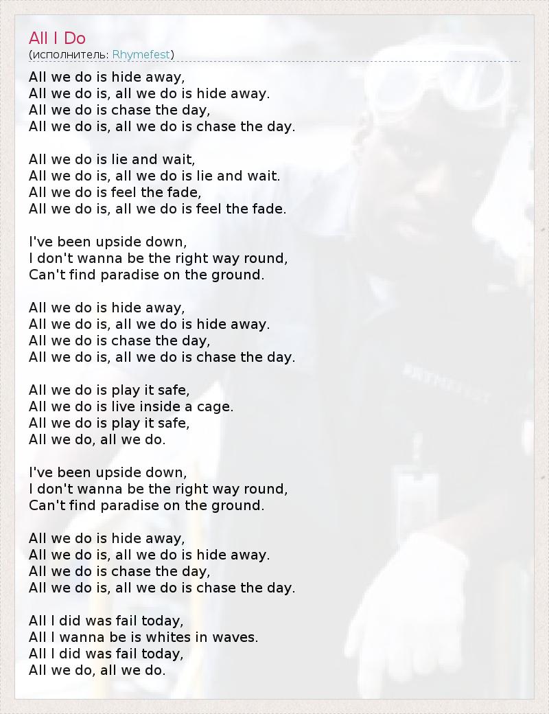Мы только и делаем, что прячемся, Мы только и делаем, мы только и делаем, что прячемся. Мы только и делаем, что гонимся за днём. Мы только и делаем, мы только и делаем, что гонимся за днём. Мы только и делаем, что лжём и ждём, Мы только и делаем, мы только и делаем, что лжём и ждём. Мы только и делаем, что ощущаем приход, Мы только и делаем, мы только и делаем, что ощущаем приход. Я вверх тормашками, Я не хочу быть в правильном положении, На земле не найти рая. Мы только и делаем, что прячемся, Мы только и делаем, мы только и делаем, что прячемся. Мы только и делаем, что гонимся за днём. Мы только и делаем, мы только и делаем, что гонимся за днём. Мы только и делаем, что не рискуем, Мы только и делаем, что живём в клетке. Мы только и делаем, что не рискуем, Мы только и делаем, мы только и делаем. Я вверх тормашками, Я не хочу быть в правильном положении, На земле не найти рая. Мы только и делаем, что прячемся, Мы только и делаем, мы только и делаем, что прячемся. Мы только и делаем, что гонимся за днём. Мы только и делаем, мы только и делаем, что гонимся за днём. Сегодня я только и делал, что терпел неудачи, Я хочу быть пеной в волнах. Сегодня я только и делал, что терпел неудачи, Мы только и делаем, мы только и делаем.