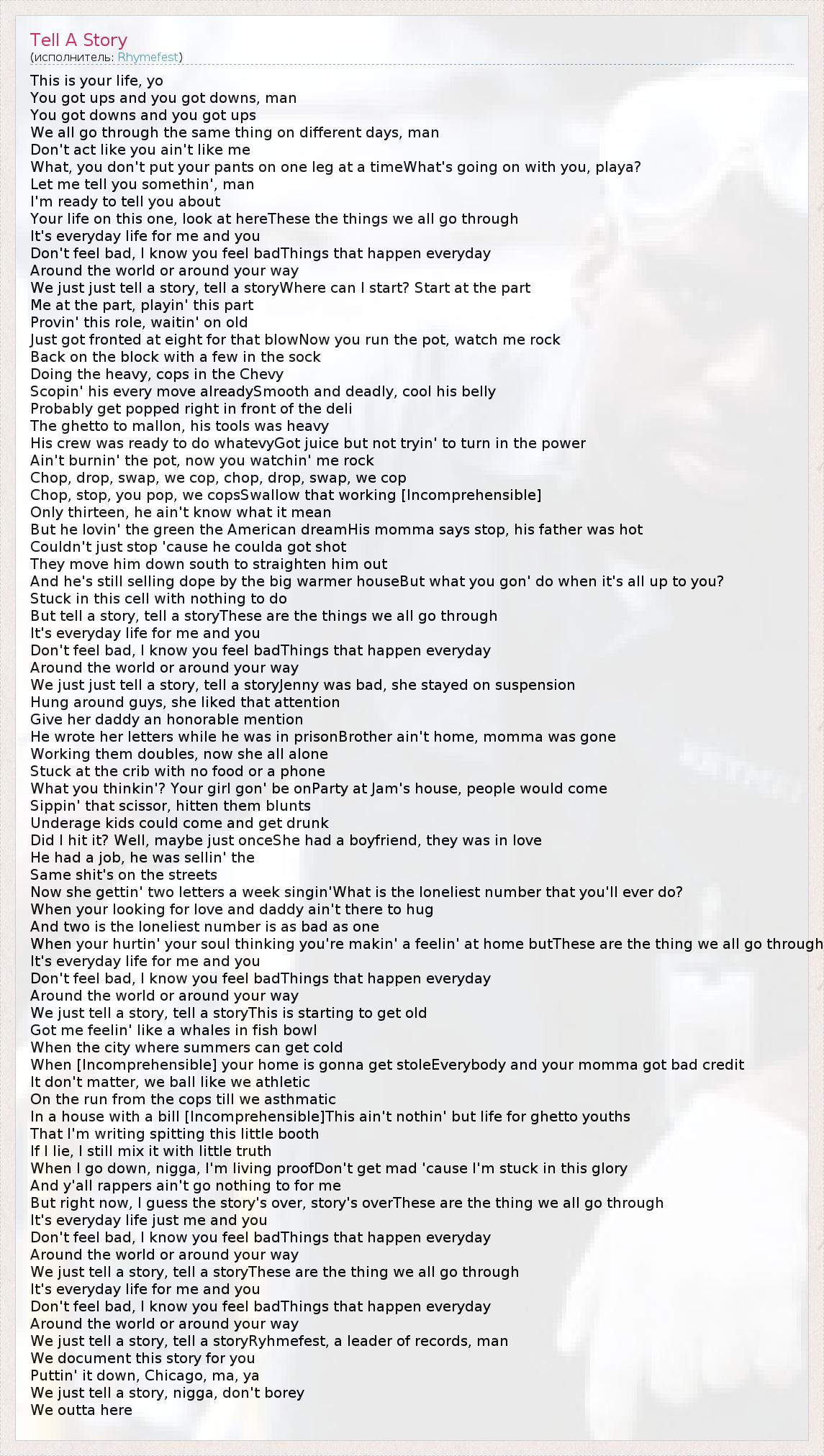 This is your life, yo You got ups and you got downs, man You got downs and you got ups We all go through the same thing on different days, man Don't act like you ain't like me What, you don't put your pants on one leg at a timeWhat's going on with you, playa? Let me tell you somethin', man I'm ready to tell you about Your life on this one, look at hereThese the things we all go through It's everyday life for me and you Don't feel bad, I know you feel badThings that happen everyday Around the world or around your way We just just tell a story, tell a storyWhere can I start? Start at the part Me at the part, playin' this part Provin' this role, waitin' on old Just got fronted at eight for that blowNow you run the pot, watch me rock Back on the block with a few in the sock Doing the heavy, cops in the Chevy Scopin' his every move alreadySmooth and deadly, cool his belly Probably get popped right in front of the deli The ghetto to mallon, his tools was heavy His crew was ready to do whatevyGot juice but not tryin' to turn in the power Ain't burnin' the pot, now you watchin' me rock Chop, drop, swap, we cop, chop, drop, swap, we cop Chop, stop, you pop, we copsSwallow that working [Incomprehensible] Only thirteen, he ain't know what it mean But he lovin' the green the American dreamHis momma says stop, his father was hot Couldn't just stop 'cause he coulda got shot They move him down south to straighten him out And he's still selling dope by the big warmer houseBut what you gon' do when it's all up to you? Stuck in this cell with nothing to do But tell a story, tell a storyThese are the things we all go through It's everyday life for me and you Don't feel bad, I know you feel badThings that happen everyday Around the world or around your way We just just tell a story, tell a storyJenny was bad, she stayed on suspension Hung around guys, she liked that attention Give her daddy an honorable mention He wrote her letters while he was in prisonBrother ain't home, momma was gone Working them doubles, now she all alone Stuck at the crib with no food or a phone What you thinkin'? Your girl gon' be onParty at Jam's house, people would come Sippin' that scissor, hitten them blunts Underage kids could come and get drunk Did I hit it? Well, maybe just onceShe had a boyfriend, they was in love He had a job, he was sellin' the Same shit's on the streets Now she gettin' two letters a week singin'What is the loneliest number that you'll ever do? When your looking for love and daddy ain't there to hug And two is the loneliest number is as bad as one When your hurtin' your soul thinking you're makin' a feelin' at home butThese are the thing we all go through It's everyday life for me and you Don't feel bad, I know you feel badThings that happen everyday Around the world or around your way We just tell a story, tell a storyThis is starting to get old Got me feelin' like a whales in fish bowl When the city where summers can get cold When [Incomprehensible] your home is gonna get stoleEverybody and your momma got bad credit It don't matter, we ball like we athletic On the run from the cops till we asthmatic In a house with a bill [Incomprehensible]This ain't nothin' but life for ghetto youths That I'm writing spitting this little booth If I lie, I still mix it with little truth When I go down, nigga, I'm living proofDon't get mad 'cause I'm stuck in this glory And y'all rappers ain't go nothing to for me But right now, I guess the story's over, story's overThese are the thing we all go through It's everyday life just me and you Don't feel bad, I know you feel badThings that happen everyday Around the world or around your way We just tell a story, tell a storyThese are the thing we all go through It's everyday life for me and you Don't feel bad, I know you feel badThings that happen everyday Around the world or around your way We just tell a story, tell a storyRyhmefest, a leader of records, man We document this story for you Puttin' it down, Chicago, ma, ya We just tell a story, nigga, don't borey We outta here