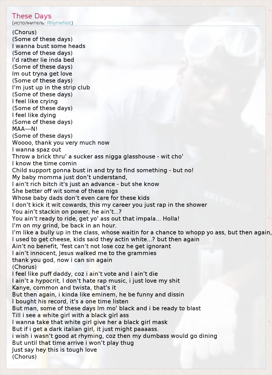 (Chorus) (Some of these days) I wanna bust some heads (Some of these days) I'd rather lie inda bed (Some of these days) Im out tryna get love (Some of these days) I'm just up in the strip club (Some of these days) I feel like crying (Some of these days) I feel like dying (Some of these days) MAA---N! (Some of these days) Woooo, thank you very much now I wanna spaz out Throw a brick thru' a sucker ass nigga glasshouse - wit cho' I know the time comin Child support gonna bust in and try to find something - but no! My baby momma just don't understand, I ain't rich bitch it's just an advance - but she know She better off wit some of these nigs Whose baby dads don't even care for these kids I don't kick it wit cowards, this my career you just rap in the shower You ain't stackin on power, he ain't...? You ain't ready to ride, get yo' ass out that impala... Holla! I'm on my grind, be back in an hour. I'm like a bully up in the class, whose waitin for a chance to whopp yo ass, but then again, I used to get cheese, kids said they actin white...? but then again Ain't no benefit, 'fest can't not lose coz he get ignorant I ain't innocent, Jesus walked me to the grammies thank you god, now i can sin again (Chorus) I feel like puff daddy, coz i ain't vote and I ain't die I ain't a hypocrit, I don't hate rap music, i just love my shit Kanye, common and twista, that's it But then again, i kinda like eminem, he be funny and dissin I bought his record, it's a one time listen But man, some of these days Im mo' black and i be ready to blast Till i see a white girl with a black girl ass I wanna take that white girl give her a black girl mask But if i get a dark italian girl, it just might paaaass. i wish i wasn't good at rhyming, coz then my dumbass would go dining But until that time arrive i won't play thug Just say hey this is tough love (Chorus)
