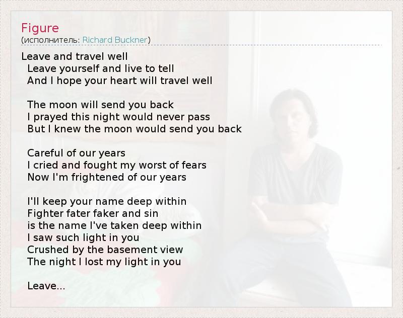 Leave and travel well Leave yourself and live to tell And I hope your heart will travel well The moon will send you back I prayed this night would never pass But I knew the moon would send you back Careful of our years I cried and fought my worst of fears Now I'm frightened of our years I'll keep your name deep within Fighter fater faker and sin is the name I've taken deep within I saw such light in you Crushed by the basement view The night I lost my light in you Leave...