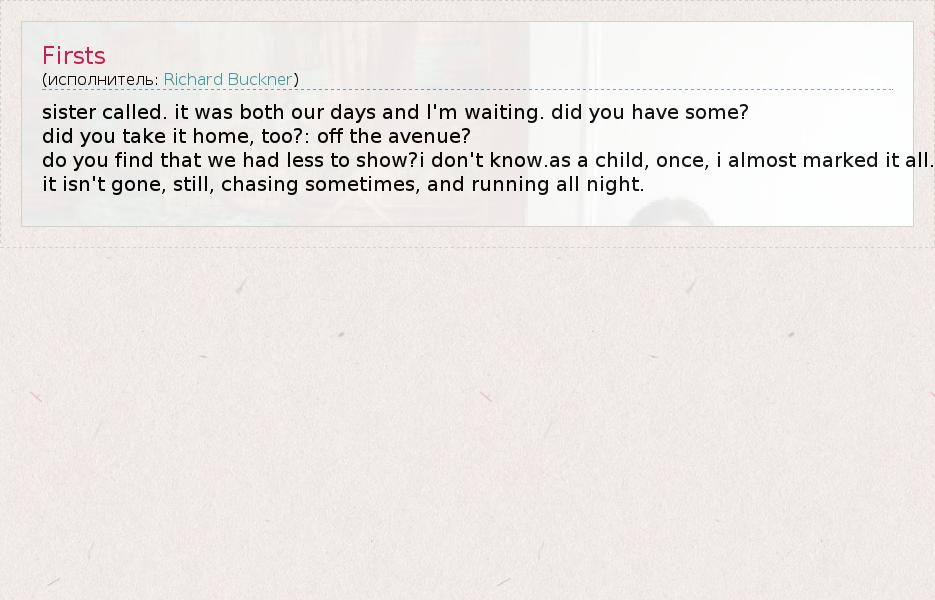 sister called. it was both our days and I'm waiting. did you have some? did you take it home, too?: off the avenue? do you find that we had less to show?i don't know.as a child, once, i almost marked it all. it isn't gone, still, chasing sometimes, and running all night.