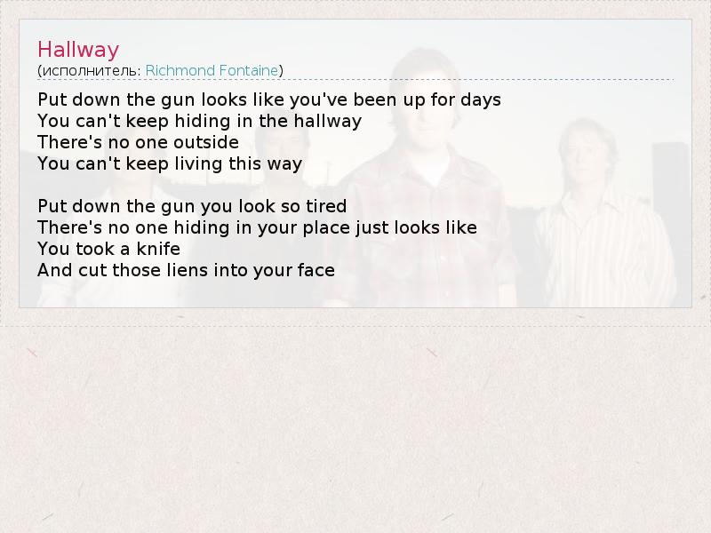 Put down the gun looks like you've been up for days You can't keep hiding in the hallway There's no one outside You can't keep living this way Put down the gun you look so tired There's no one hiding in your place just looks like You took a knife And cut those liens into your face