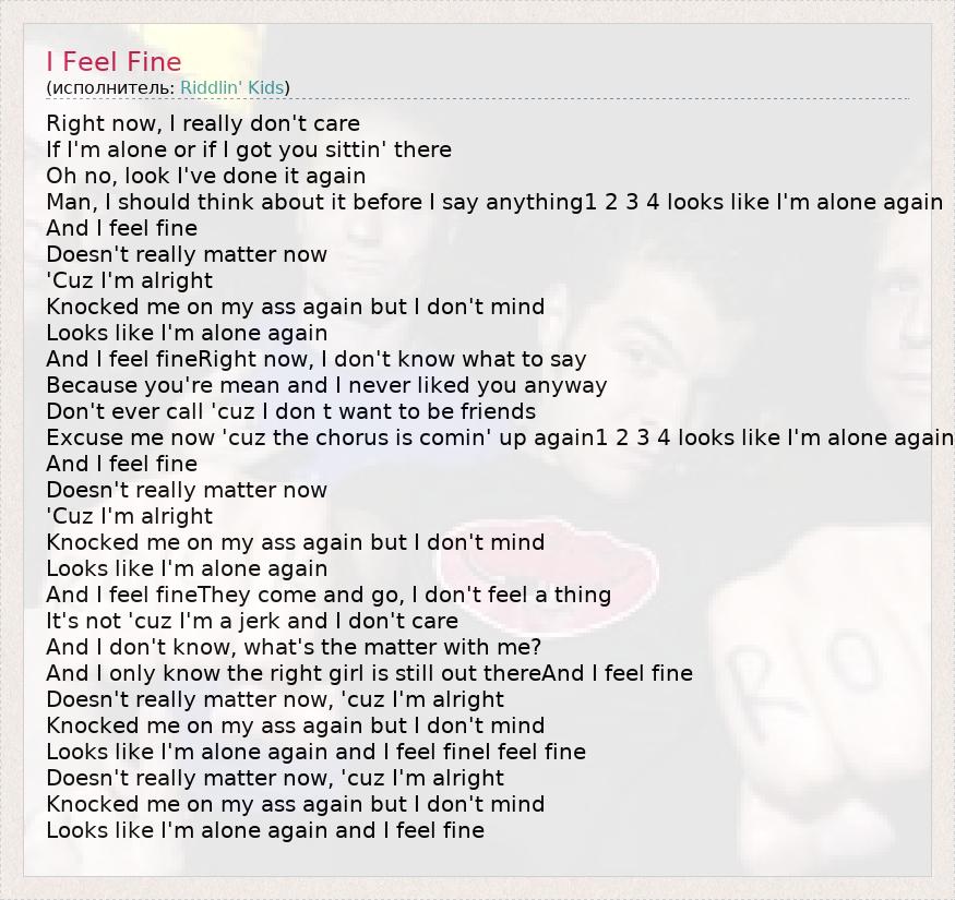 Right now, I really don't care If I'm alone or if I got you sittin' there Oh no, look I've done it again Man, I should think about it before I say anything1 2 3 4 looks like I'm alone again And I feel fine Doesn't really matter now 'Cuz I'm alright Knocked me on my ass again but I don't mind Looks like I'm alone again And I feel fineRight now, I don't know what to say Because you're mean and I never liked you anyway Don't ever call 'cuz I don t want to be friends Excuse me now 'cuz the chorus is comin' up again1 2 3 4 looks like I'm alone again And I feel fine Doesn't really matter now 'Cuz I'm alright Knocked me on my ass again but I don't mind Looks like I'm alone again And I feel fineThey come and go, I don't feel a thing It's not 'cuz I'm a jerk and I don't care And I don't know, what's the matter with me? And I only know the right girl is still out thereAnd I feel fine Doesn't really matter now, 'cuz I'm alright Knocked me on my ass again but I don't mind Looks like I'm alone again and I feel fineI feel fine Doesn't really matter now, 'cuz I'm alright Knocked me on my ass again but I don't mind Looks like I'm alone again and I feel fine