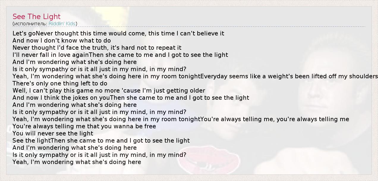 Let's goNever thought this time would come, this time I can't believe it And now I don't know what to do Never thought I'd face the truth, it's hard not to repeat it I'll never fall in love againThen she came to me and I got to see the light And I'm wondering what she's doing here Is it only sympathy or is it all just in my mind, in my mind? Yeah, I'm wondering what she's doing here in my room tonightEveryday seems like a weight's been lifted off my shoulders There's only one thing left to do Well, I can't play this game no more 'cause I'm just getting older And now I think the jokes on youThen she came to me and I got to see the light And I'm wondering what she's doing here Is it only sympathy or is it all just in my mind, in my mind? Yeah, I'm wondering what she's doing here in my room tonightYou're always telling me, you're always telling me You're always telling me that you wanna be free You will never see the light See the lightThen she came to me and I got to see the light And I'm wondering what she's doing here Is it only sympathy or is it all just in my mind, in my mind? Yeah, I'm wondering what she's doing here