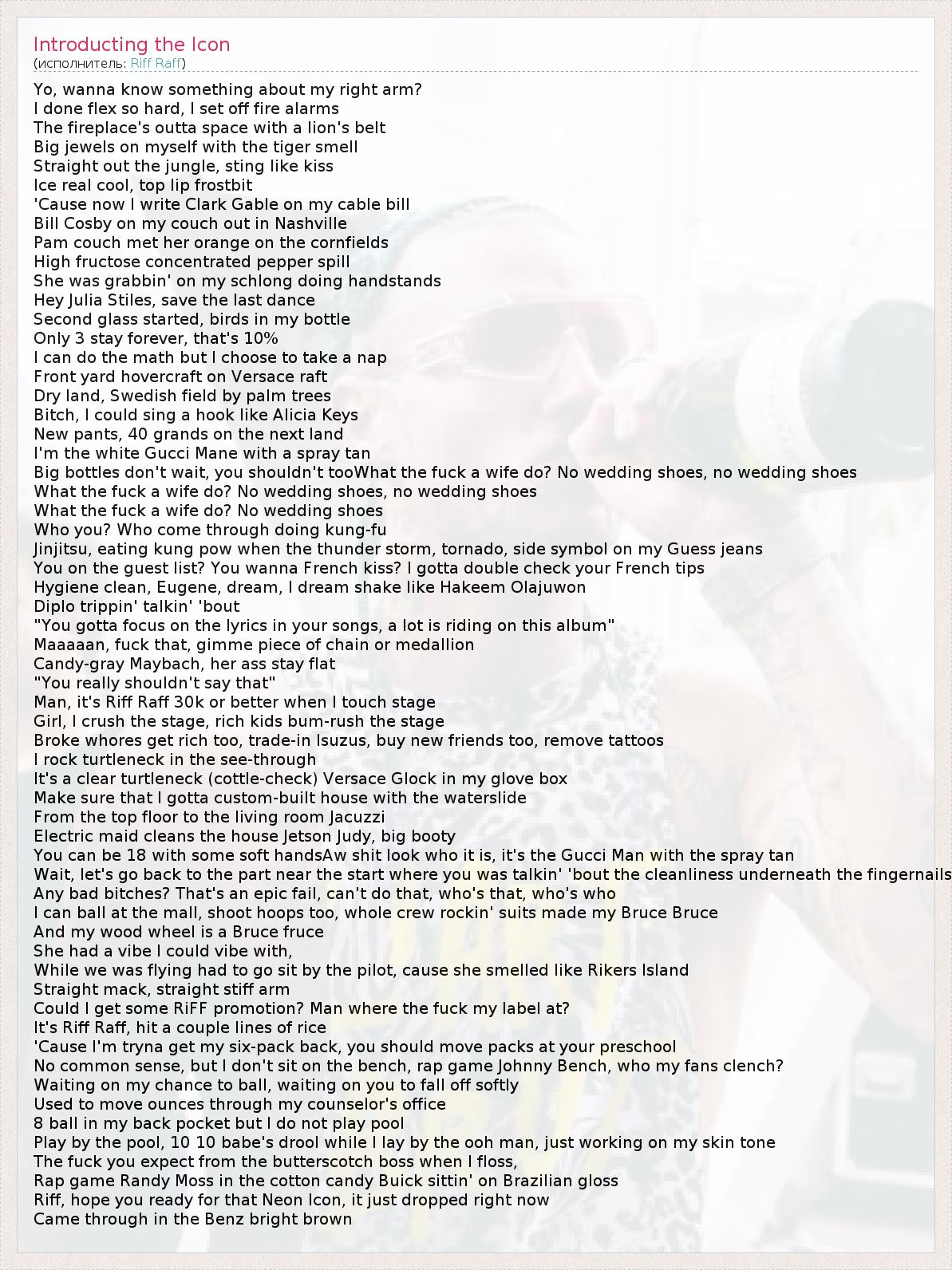 Yo, wanna know something about my right arm? I done flex so hard, I set off fire alarms The fireplace's outta space with a lion's belt Big jewels on myself with the tiger smell Straight out the jungle, sting like kiss Ice real cool, top lip frostbit 'Cause now I write Clark Gable on my cable bill Bill Cosby on my couch out in Nashville Pam couch met her orange on the cornfields High fructose concentrated pepper spill She was grabbin' on my schlong doing handstands Hey Julia Stiles, save the last dance Second glass started, birds in my bottle Only 3 stay forever, that's 10% I can do the math but I choose to take a nap Front yard hovercraft on Versace raft Dry land, Swedish field by palm trees Bitch, I could sing a hook like Alicia Keys New pants, 40 grands on the next land I'm the white Gucci Mane with a spray tan Big bottles don't wait, you shouldn't tooWhat the fuck a wife do? No wedding shoes, no wedding shoes What the fuck a wife do? No wedding shoes, no wedding shoes What the fuck a wife do? No wedding shoes Who you? Who come through doing kung-fu Jinjitsu, eating kung pow when the thunder storm, tornado, side symbol on my Guess jeans You on the guest list? You wanna French kiss? I gotta double check your French tips Hygiene clean, Eugene, dream, I dream shake like Hakeem Olajuwon Diplo trippin' talkin' 'bout "You gotta focus on the lyrics in your songs, a lot is riding on this album" Maaaaan, fuck that, gimme piece of chain or medallion Candy-gray Maybach, her ass stay flat "You really shouldn't say that" Man, it's Riff Raff 30k or better when I touch stage Girl, I crush the stage, rich kids bum-rush the stage Broke whores get rich too, trade-in Isuzus, buy new friends too, remove tattoos I rock turtleneck in the see-through It's a clear turtleneck (cottle-check) Versace Glock in my glove box Make sure that I gotta custom-built house with the waterslide From the top floor to the living room Jacuzzi Electric maid cleans the house Jetson Judy, big booty You can be 18 with some soft handsAw shit look who it is, it's the Gucci Man with the spray tan Wait, let's go back to the part near the start where you was talkin' 'bout the cleanliness underneath the fingernails Any bad bitches? That's an epic fail, can't do that, who's that, who's who I can ball at the mall, shoot hoops too, whole crew rockin' suits made my Bruce Bruce And my wood wheel is a Bruce fruce She had a vibe I could vibe with, While we was flying had to go sit by the pilot, cause she smelled like Rikers Island Straight mack, straight stiff arm Could I get some RiFF promotion? Man where the fuck my label at? It's Riff Raff, hit a couple lines of rice 'Cause I'm tryna get my six-pack back, you should move packs at your preschool No common sense, but I don't sit on the bench, rap game Johnny Bench, who my fans clench? Waiting on my chance to ball, waiting on you to fall off softly Used to move ounces through my counselor's office 8 ball in my back pocket but I do not play pool Play by the pool, 10 10 babe's drool while I lay by the ooh man, just working on my skin tone The fuck you expect from the butterscotch boss when I floss, Rap game Randy Moss in the cotton candy Buick sittin' on Brazilian gloss Riff, hope you ready for that Neon Icon, it just dropped right now Came through in the Benz bright brown