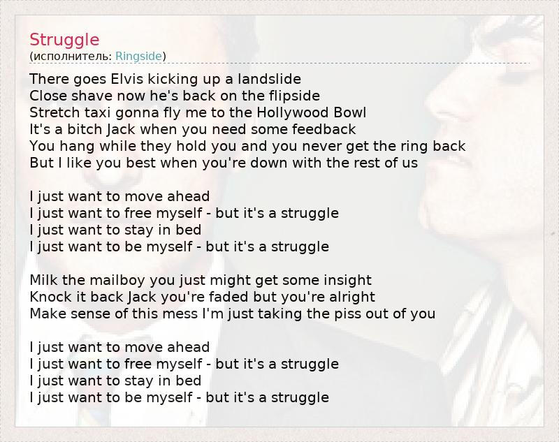 There goes Elvis kicking up a landslide Close shave now he's back on the flipside Stretch taxi gonna fly me to the Hollywood Bowl It's a bitch Jack when you need some feedback You hang while they hold you and you never get the ring back But I like you best when you're down with the rest of us I just want to move ahead I just want to free myself - but it's a struggle I just want to stay in bed I just want to be myself - but it's a struggle Milk the mailboy you just might get some insight Knock it back Jack you're faded but you're alright Make sense of this mess I'm just taking the piss out of you I just want to move ahead I just want to free myself - but it's a struggle I just want to stay in bed I just want to be myself - but it's a struggle