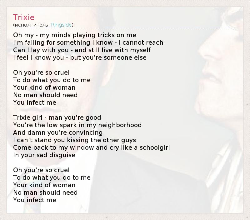 Oh my - my minds playing tricks on me I'm falling for something I know - I cannot reach Can I lay with you - and still live with myself I feel I know you - but you're someone else Oh you're so cruel To do what you do to me Your kind of woman No man should need You infect me Trixie girl - man you're good You're the low spark in my neighborhood And damn you're convincing I can't stand you kissing the other guys Come back to my window and cry like a schoolgirl In your sad disguise Oh you're so cruel To do what you do to me Your kind of woman No man should need You infect me