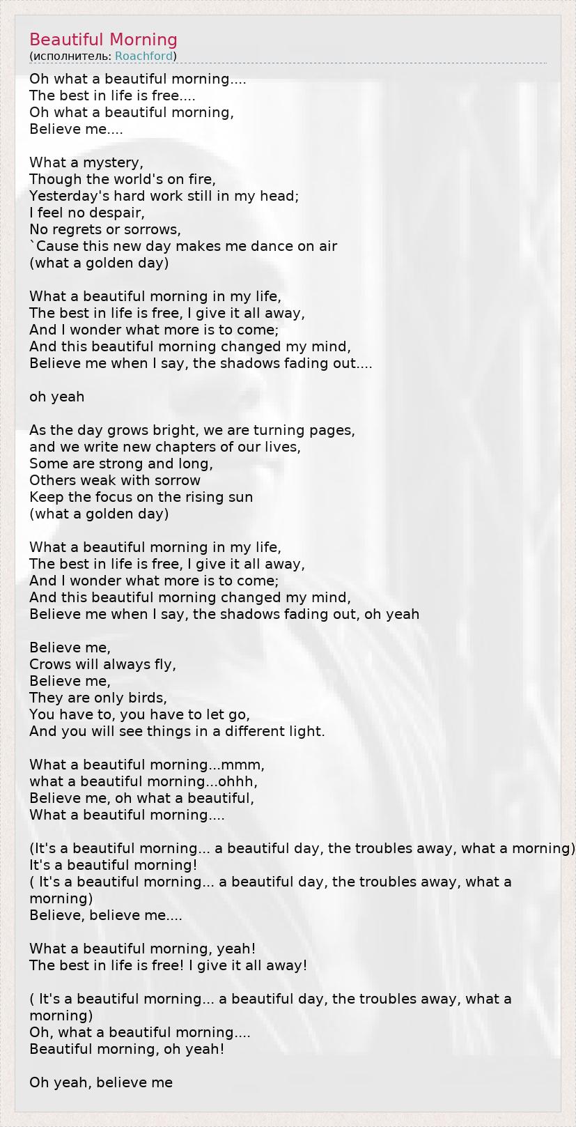Ах какое прекрасное утро Это лучшее в жизни свобода Ах какое прекрасное утро….поверь мне Что за таинство Хотя мир в огне Вчерашняя тяжёлая работа ещё в голове Я чуствую не отчяявшейся Нет сожаленья и печали Потому-что этот новый день делает меня танцующей в воздухе (какой золотой день) что за прекрасное утро в моей жизни это лучшее в жизни быть свободным я даю это всем (кто)далеко и я удивляюсь что большинство приходит и это прекрасное утро изменило мою жизнь поверь мне когда я скажу, тени затухают снаружи когда этот день растёт ярко, мы переворачиваем страницы и мы пишем новые главы нашей жизни некоторые сильные и длинные другие слабые с печалью задерживаем внимание на восходе солнца (какой золотой день) Что… Поверь мне, вороны будут всегда летать Поверь мне, они только птицы Ты имеешь тоже, ты можешь дать идти И ты увидишь вещи в изменённом свете Что… Это прекрасное утро, прекрасный день Заботы далеко, что за утро Это прекрасное утро……….