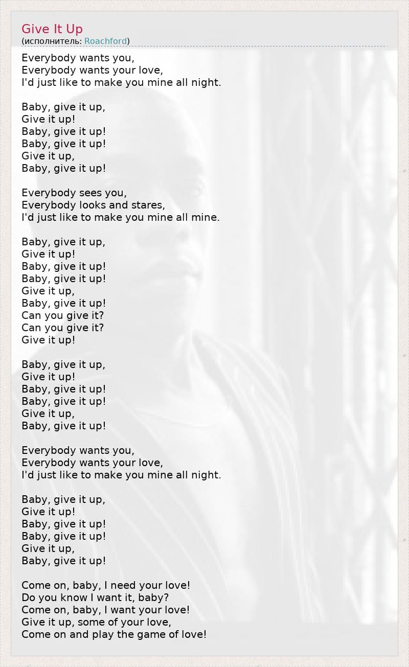 Everybody wants you, Everybody wants your love, I'd just like to make you mine all night. Baby, give it up, Give it up! Baby, give it up! Baby, give it up! Give it up, Baby, give it up! Everybody sees you, Everybody looks and stares, I'd just like to make you mine all mine. Baby, give it up, Give it up! Baby, give it up! Baby, give it up! Give it up, Baby, give it up! Can you give it? Can you give it? Give it up! Baby, give it up, Give it up! Baby, give it up! Baby, give it up! Give it up, Baby, give it up! Everybody wants you, Everybody wants your love, I'd just like to make you mine all night. Baby, give it up, Give it up! Baby, give it up! Baby, give it up! Give it up, Baby, give it up! Come on, baby, I need your love! Do you know I want it, baby? Come on, baby, I want your love! Give it up, some of your love, Come on and play the game of love!