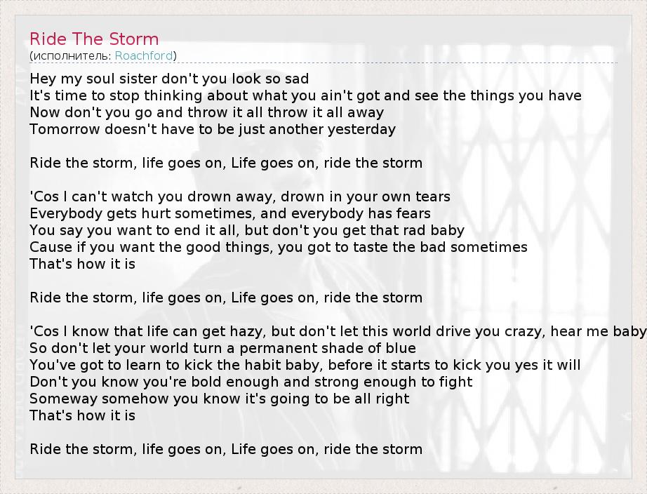 Hey my soul sister don't you look so sad It's time to stop thinking about what you ain't got and see the things you have Now don't you go and throw it all throw it all away Tomorrow doesn't have to be just another yesterday Ride the storm, life goes on, Life goes on, ride the storm 'Cos I can't watch you drown away, drown in your own tears Everybody gets hurt sometimes, and everybody has fears You say you want to end it all, but don't you get that rad baby Cause if you want the good things, you got to taste the bad sometimes That's how it is Ride the storm, life goes on, Life goes on, ride the storm 'Cos I know that life can get hazy, but don't let this world drive you crazy, hear me baby So don't let your world turn a permanent shade of blue You've got to learn to kick the habit baby, before it starts to kick you yes it will Don't you know you're bold enough and strong enough to fight Someway somehow you know it's going to be all right That's how it is Ride the storm, life goes on, Life goes on, ride the storm