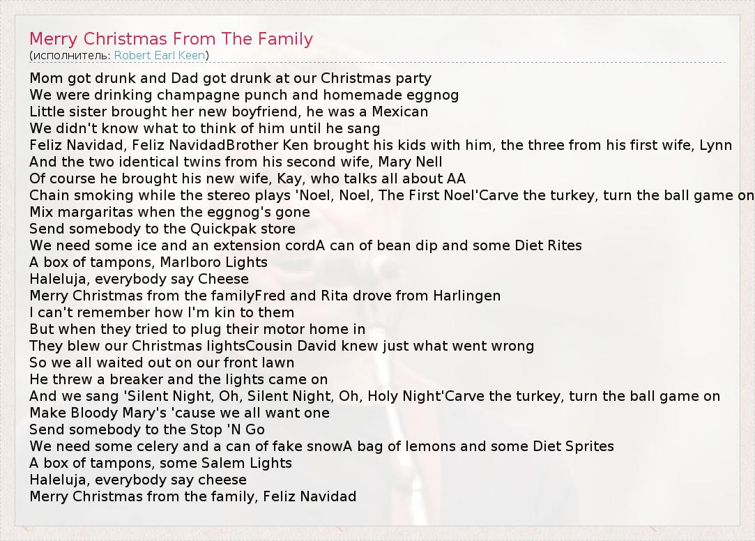 Mom got drunk and Dad got drunk at our Christmas party We were drinking champagne punch and homemade eggnog Little sister brought her new boyfriend, he was a Mexican We didn't know what to think of him until he sang Feliz Navidad, Feliz NavidadBrother Ken brought his kids with him, the three from his first wife, Lynn And the two identical twins from his second wife, Mary Nell Of course he brought his new wife, Kay, who talks all about AA Chain smoking while the stereo plays 'Noel, Noel, The First Noel'Carve the turkey, turn the ball game on Mix margaritas when the eggnog's gone Send somebody to the Quickpak store We need some ice and an extension cordA can of bean dip and some Diet Rites A box of tampons, Marlboro Lights Haleluja, everybody say Cheese Merry Christmas from the familyFred and Rita drove from Harlingen I can't remember how I'm kin to them But when they tried to plug their motor home in They blew our Christmas lightsCousin David knew just what went wrong So we all waited out on our front lawn He threw a breaker and the lights came on And we sang 'Silent Night, Oh, Silent Night, Oh, Holy Night'Carve the turkey, turn the ball game on Make Bloody Mary's 'cause we all want one Send somebody to the Stop 'N Go We need some celery and a can of fake snowA bag of lemons and some Diet Sprites A box of tampons, some Salem Lights Haleluja, everybody say cheese Merry Christmas from the family, Feliz Navidad